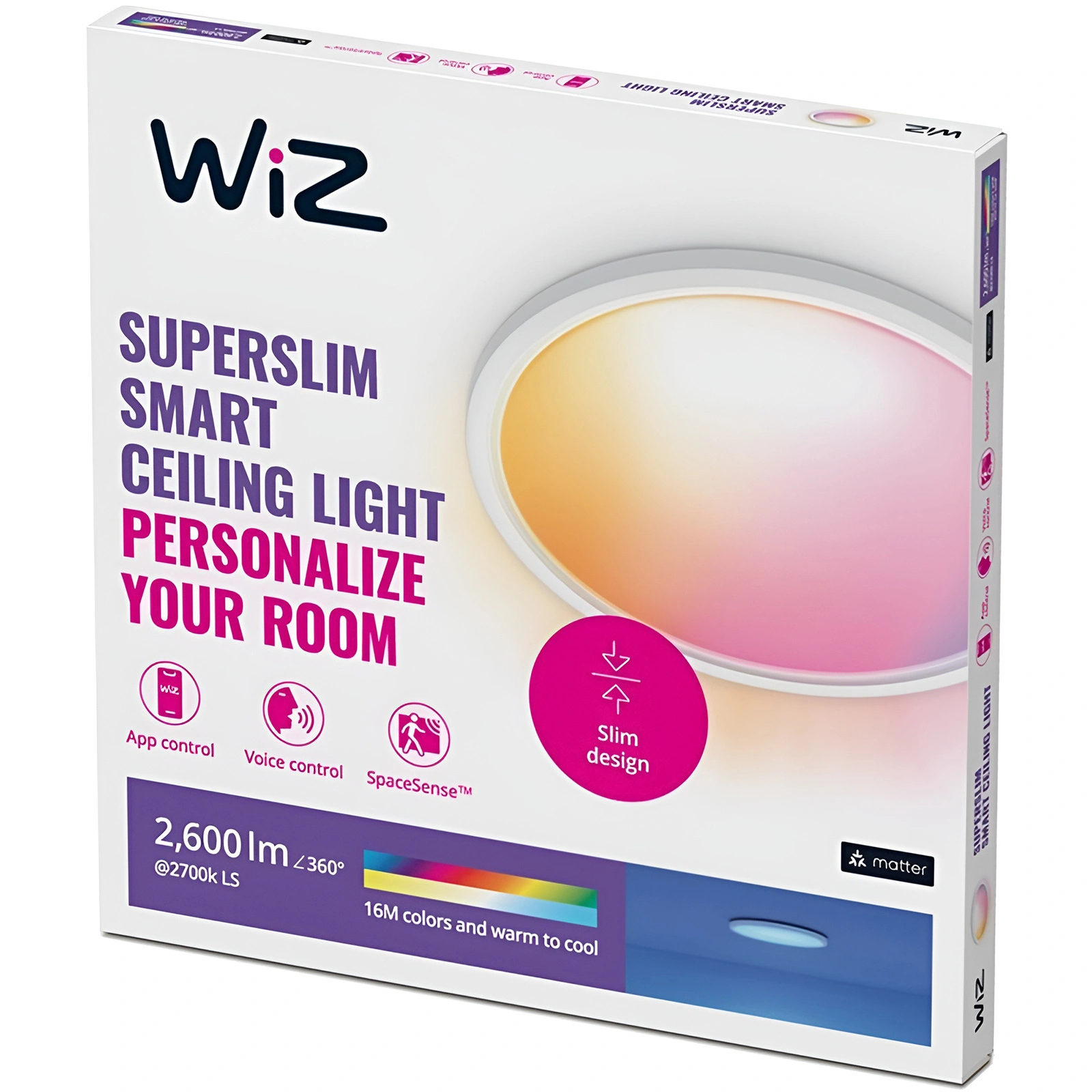 Inteligentní stropní svítidlo LED, řada plafond WiZ SuperSlim je moderní řešení osvětlení, které kombinuje pokročilou technologii s elegantním designem. Svítidlo je energeticky úsporné a zároveň poskytuje dostatek světla pro většinu interiérů. Je vybaveno pokročilou technologií SMART WiFi a poskytuje uživatelský komfort a široké možnosti personalizace osvětlení prostřednictvím ovládání přes mobilní aplikaci WiZ Connected.
