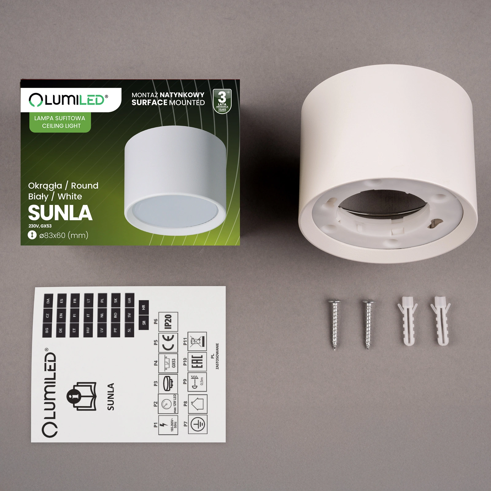 Svítidlo je vybaveno šroubovací paticí (závitem) GX53, která nám umožňuje zvolit si LED a klasické žárovky vhodného výkonu a barvy světla podle našich potřeb, maximální výkon světelného zdroje však nesmí překročit 12W LED.