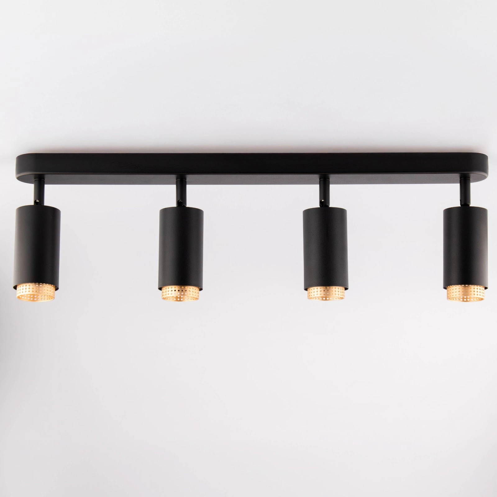 Černý a zlatý reflektor navržen pro montáž na strop, což umožňuje přesné osvětlení místnosti. Válcový design lampy jí dodává moderní a elegantní charakter. Reflektory jsou pohyblivé, takže lze snadno měnit směr světla, poskytuje všestranné použití. Je ideální pro domácí interiéry, jako jsou obývací pokoje, chodby a ložnice, i pro komerční prostory, jako jsou výlohy obchodů a kanceláře.