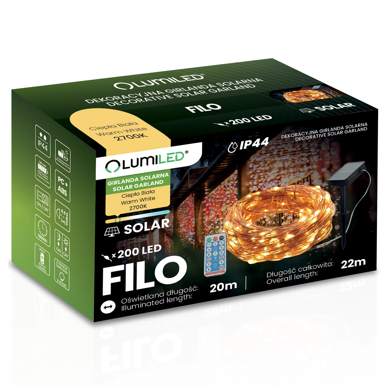 Solární zahradní girlanda 200x LED Dekorativní drátkové osvětlení 22m 2700K teplá bílá + Dálkové ovládání FILO LUMILED