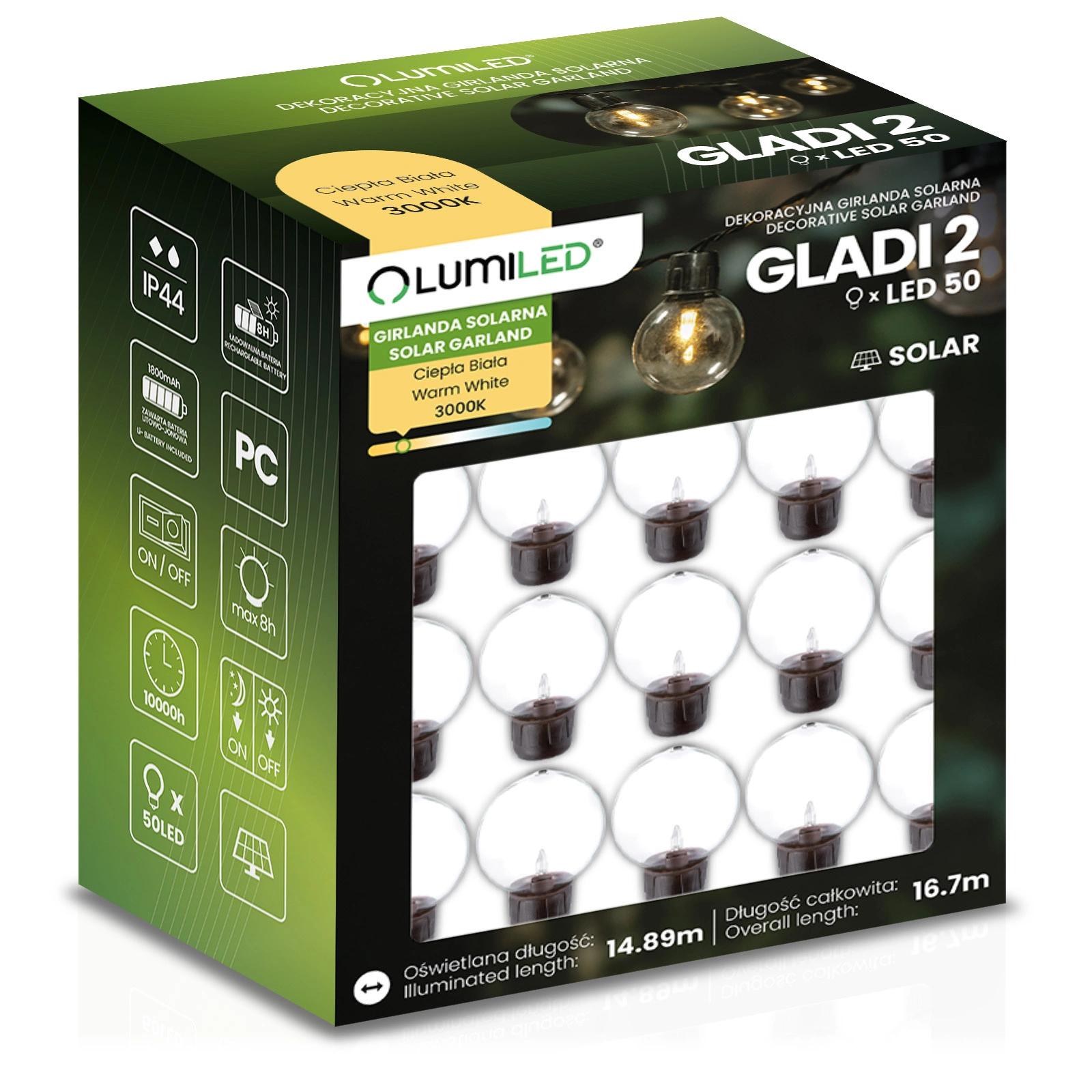 Solární girlanda Gladi2 od renomovaného výrobce osvětlení Lumiled je navržena tak, aby vytvořila náladovou a útulnou atmosféru. Skvěle se hodí do zahrady a díky svému elegantnímu designu může fungovat jako dekorativní i praktický zdroj světla, ideální pro altány, terasy nebo rekreační prostory.