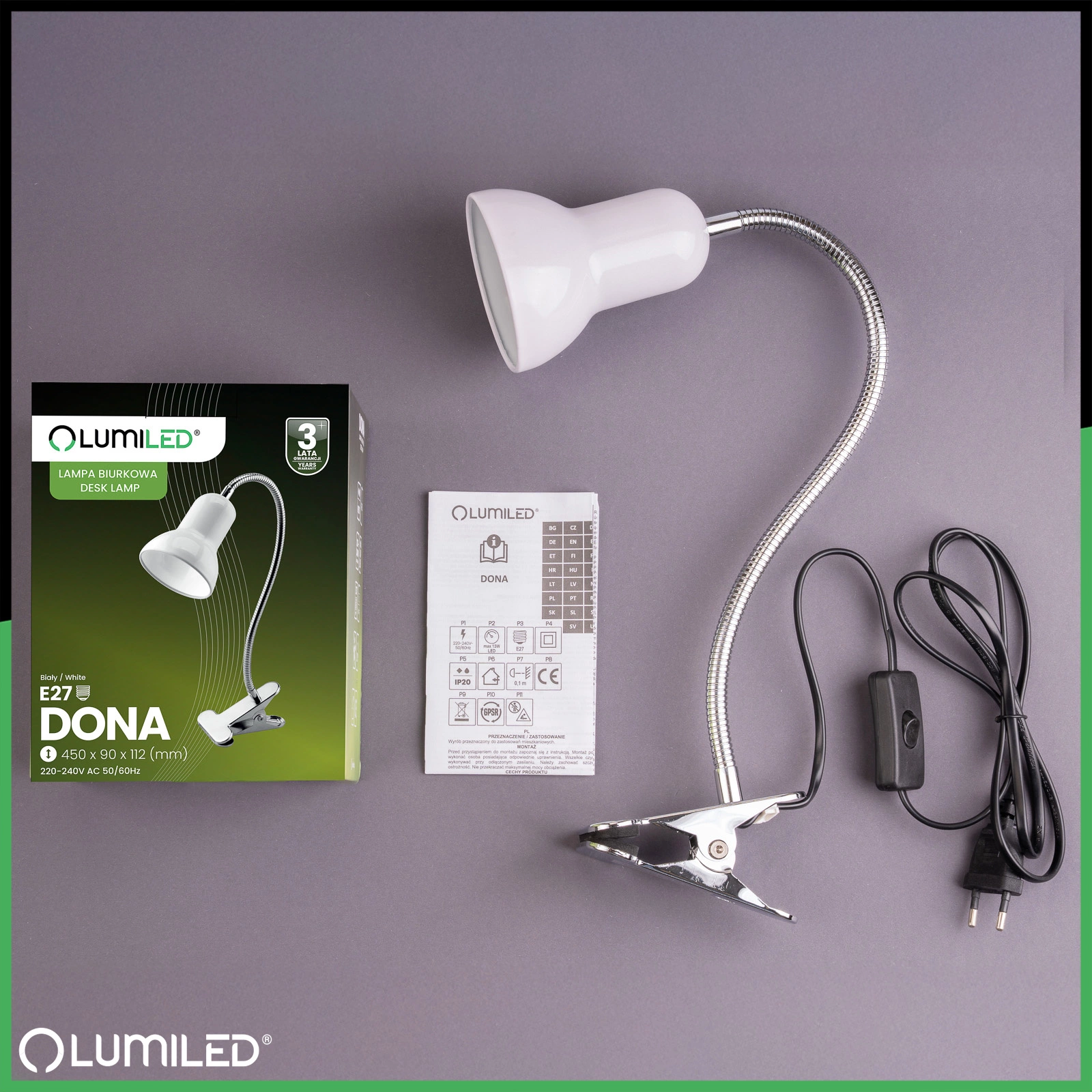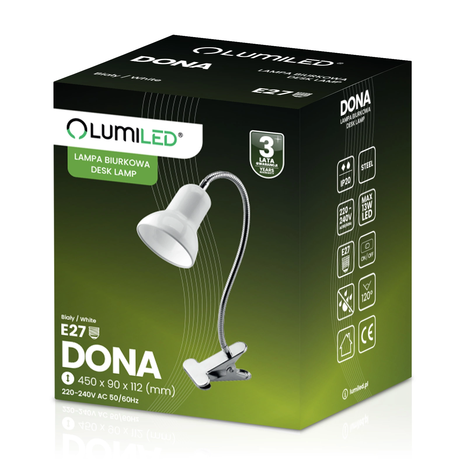 Stolní lampa DONA od renomované značky osvětlení LUMILED v bílé barvě, je stylové a funkční osvětlení, které se hodí do každé místnosti. Elegantní barevné provedení, dodává lampě DONA moderní a minimalistický vzhled. Má standardní dřík, závit E27 což znamená, že je kompatibilní s různými typy žárovek s tímto závitem maximálním příkonem světelného zdroje 12 W. Nastavitelné rameno umožňuje nastavit směr a výšku světla.