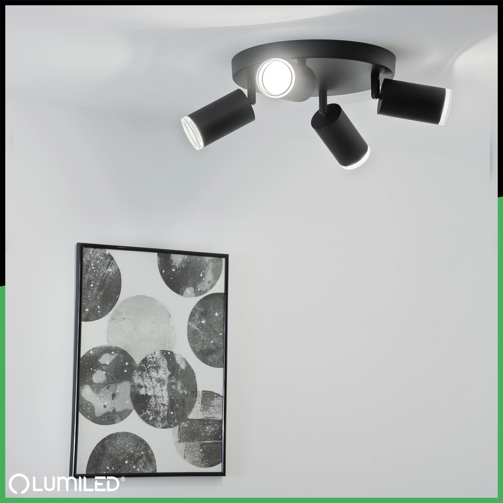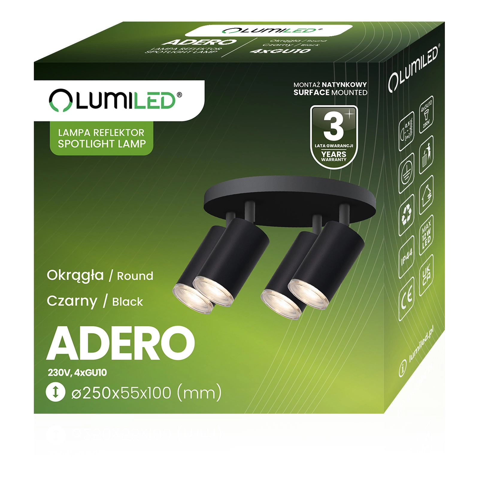 Svítidlo se 4 LED reflektory ze série ADERO od společnosti Lumiled v černé barvě se šroubovací paticí GU10 je dokonalou kombinací moderního designu a účinné osvětlovací technologie. Díky svému minimalistickému designu se hodí do mnoha domácích i komerčních prostor. Je vyroben z vysoce kvalitních materiálů, což zajišťuje jeho trvanlivost a elegantní vzhled. Černý reflektor z odolného kovu bude ve vaší domácnosti nejen dobře vypadat, ale je také odolný proti mechanickému poškození, což zaručuje dlouhou životnost. Díky jednoduchému, ale stylovému designu je se dokonale hodí do mnoha interiérů, od moderního ke klasickému. Výhodou svítidla je možnost montáže libovolné žárovky se závitem GU10 o příkonu až 12 W.