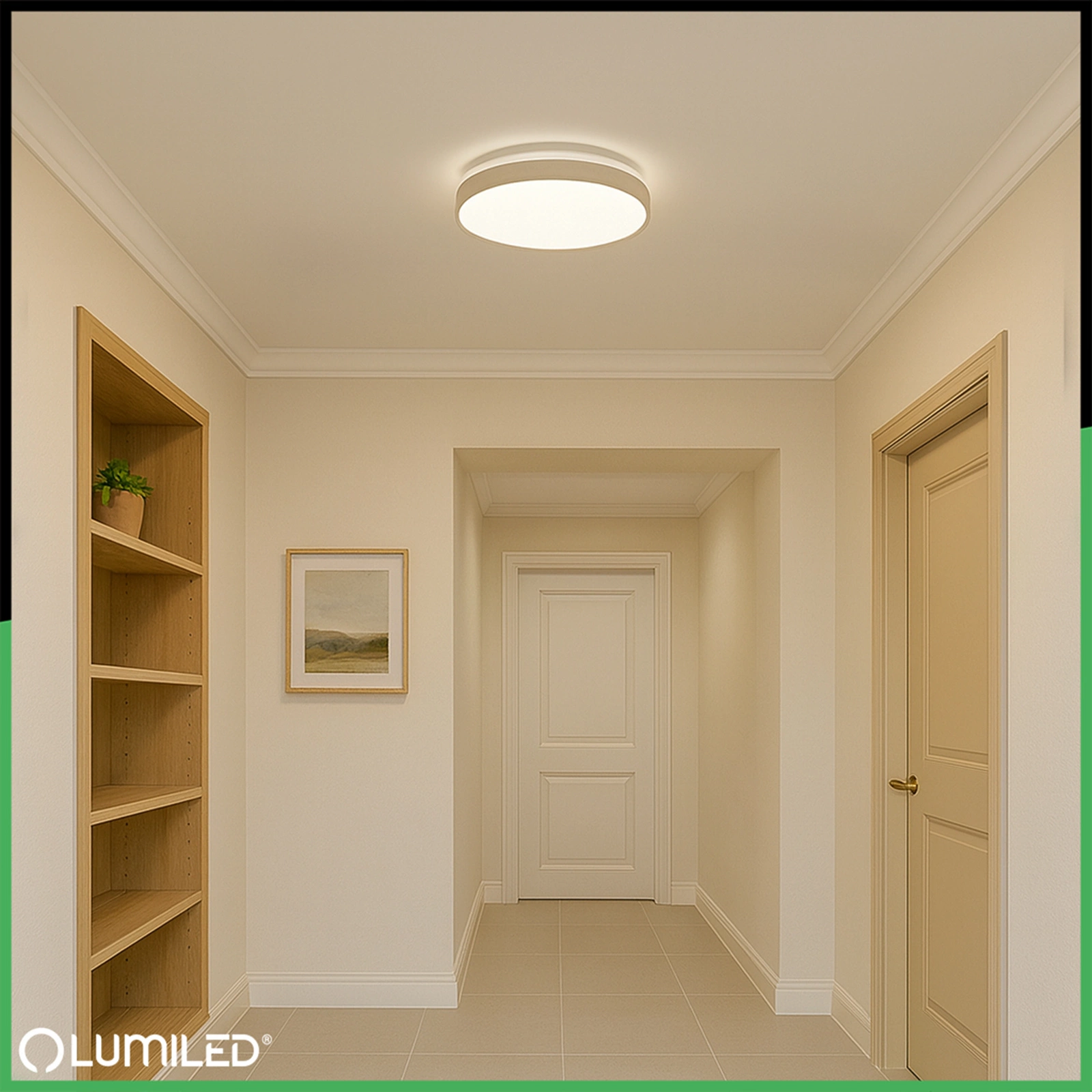 LED plafón o průměru 35 cm je moderní a funkční osvětlení, která kombinuje energetickou účinnost s estetickým designem. Kruhový tvar a mléčné stínidlo zajišťují rovnoměrné rozložení světla po celé místnosti a vytvářejí příjemnou a útulnou atmosféru v ložnici, obývacím pokoji nebo jiných prostorách. Svítidlo s 24 W, napájené LED diodami, poskytuje výjimečný jas, dostatečnou viditelnost a pohodlí v každém interiéru. Díky moderní technologii LED se plafond vyznačuje vysokou energetickou účinností, což znamená, že ve srovnání s tradičními světelnými zdroji spotřebuje výrazně méně energie. To se projevuje v nižších účtech za elektřinu, takže jde o nákladově efektivní a ekologické řešení.