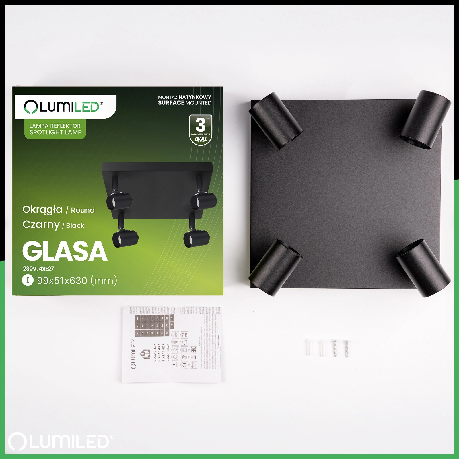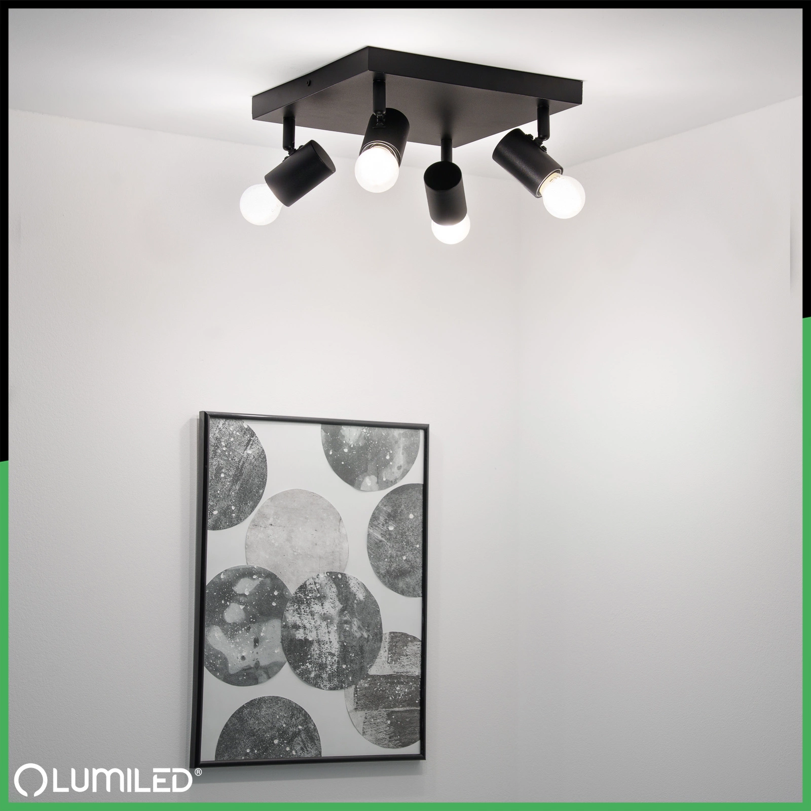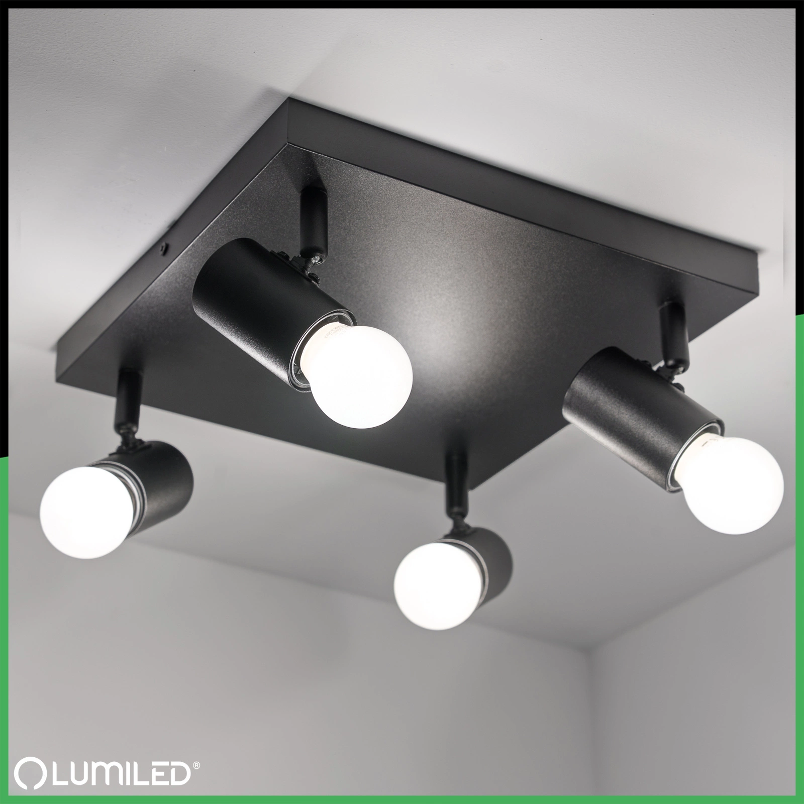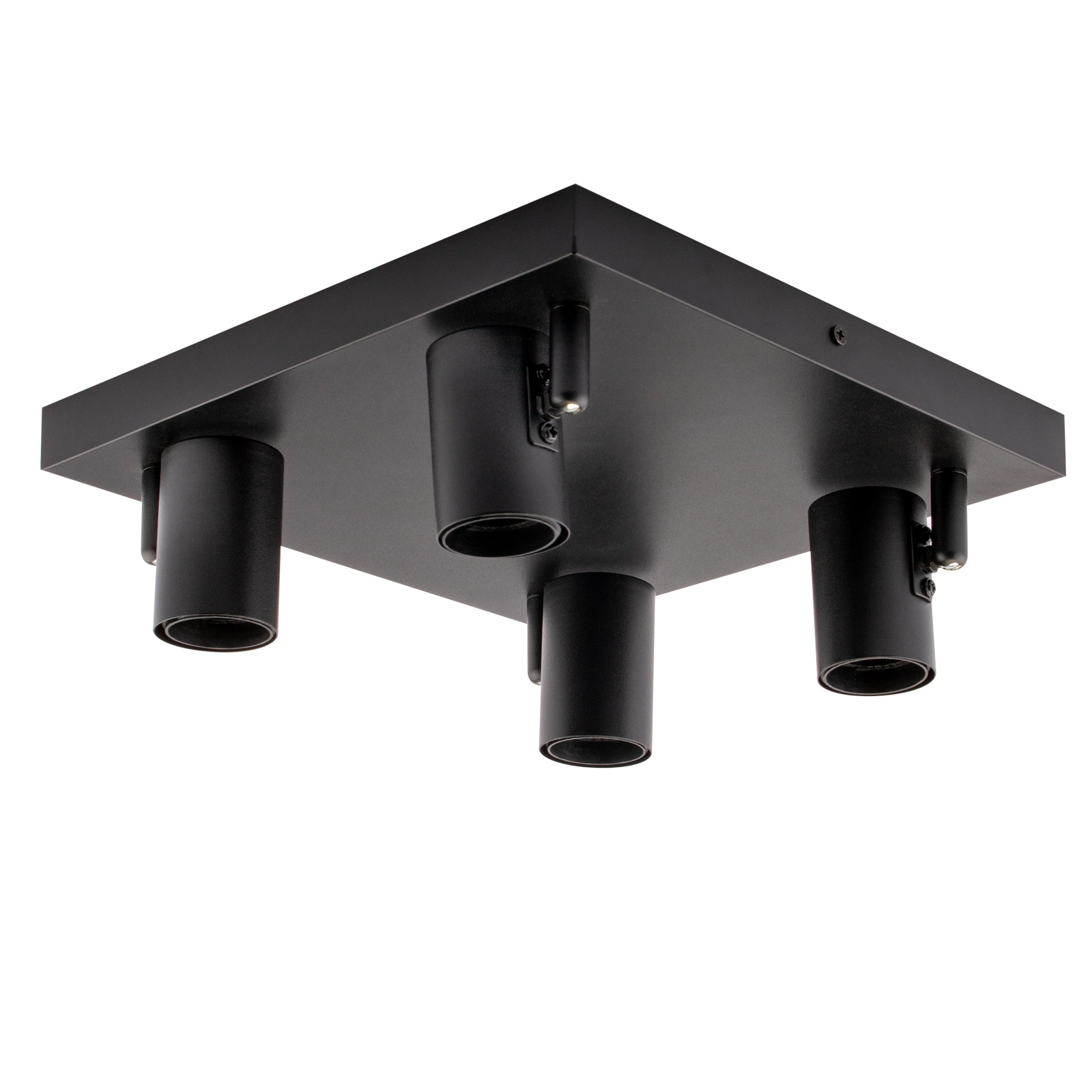 Stropní svítidlo, plafón série GLASA od společnosti Lumiled s moderním, minimalistickým designem je ideální volbou pro každý interiér. Prezentovaný model v černé barvě byl vybaven čtyřmi paticemi pro žárovky E27, která umožňuje použití úsporných LED žárovek i klasických žárovek. Nastavitelný úhel dopadu světla umožňuje přesné osvětlení vybraných oblastí v místnosti. Díky jednoduchému designu a jemné matné povrchové úpravě se lampa dokonale hodí do moderních, skandinávských nebo loftových interiérů. Je ideální jako celkové i bodové osvětlení, které dokonale zvýrazní detaily, jako jsou obrazy, police nebo dekorace.