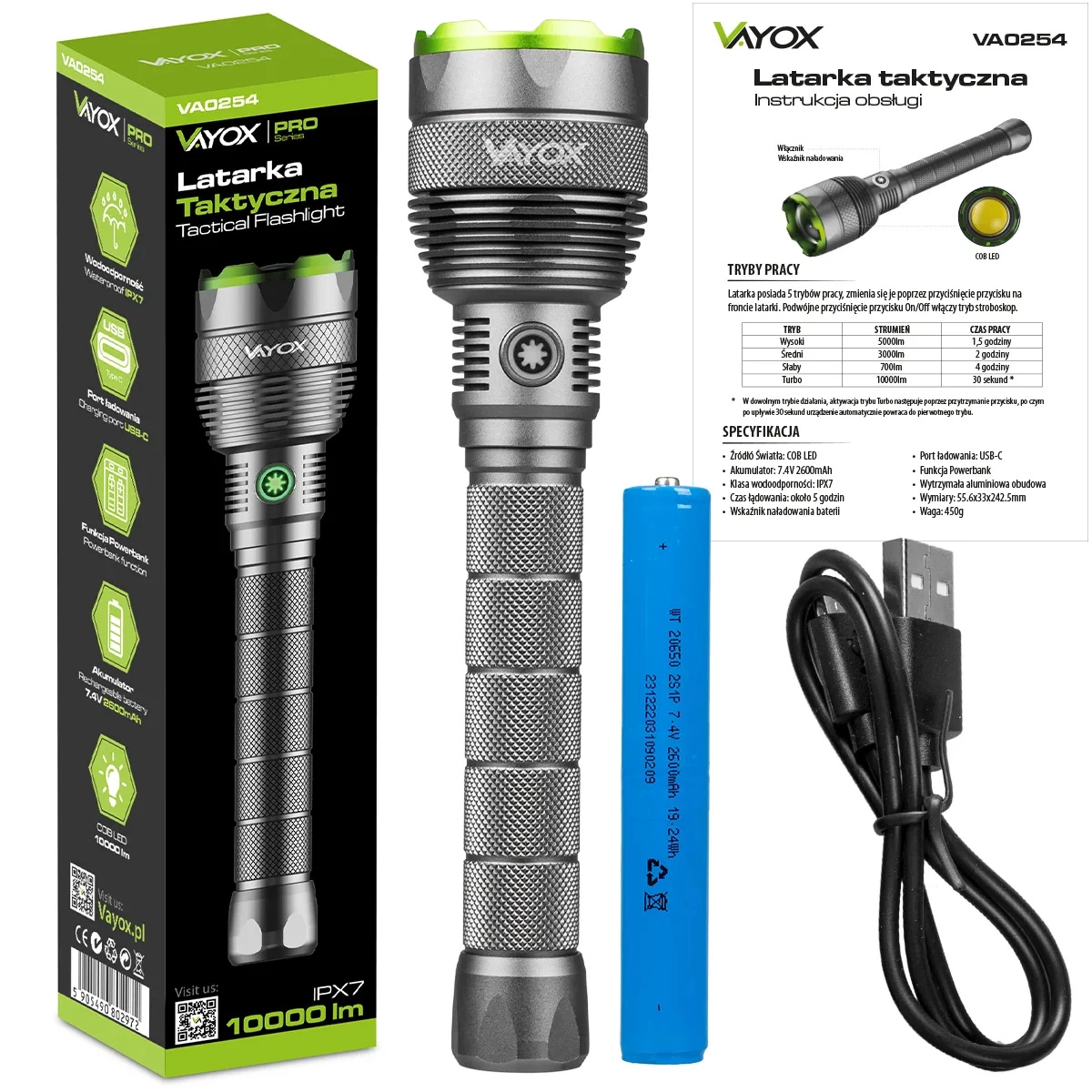 Taktická LED svítilna Vodotěsná dobíjecí USB- C 10000lm IPX7 / OB 4 Vayox