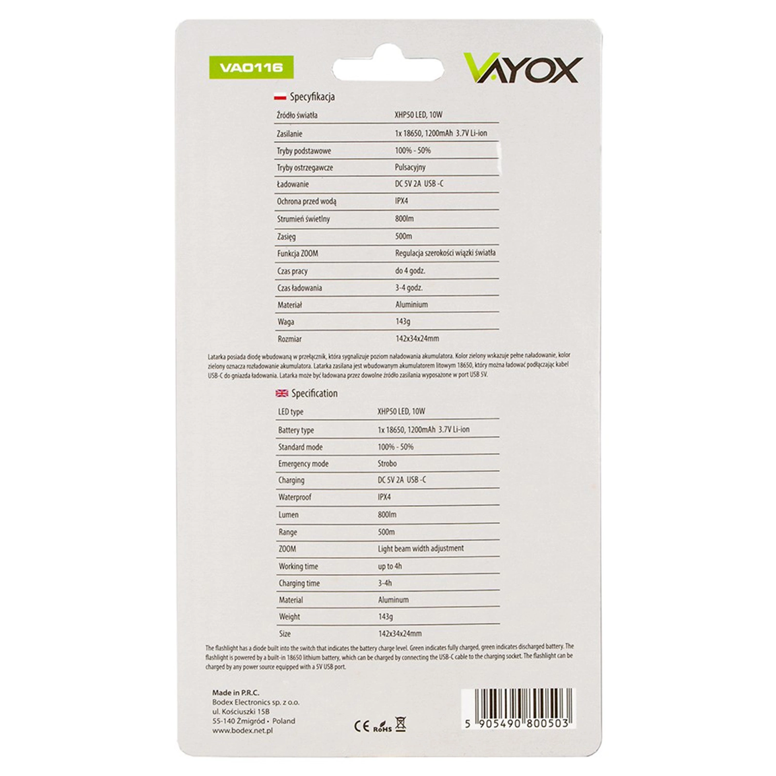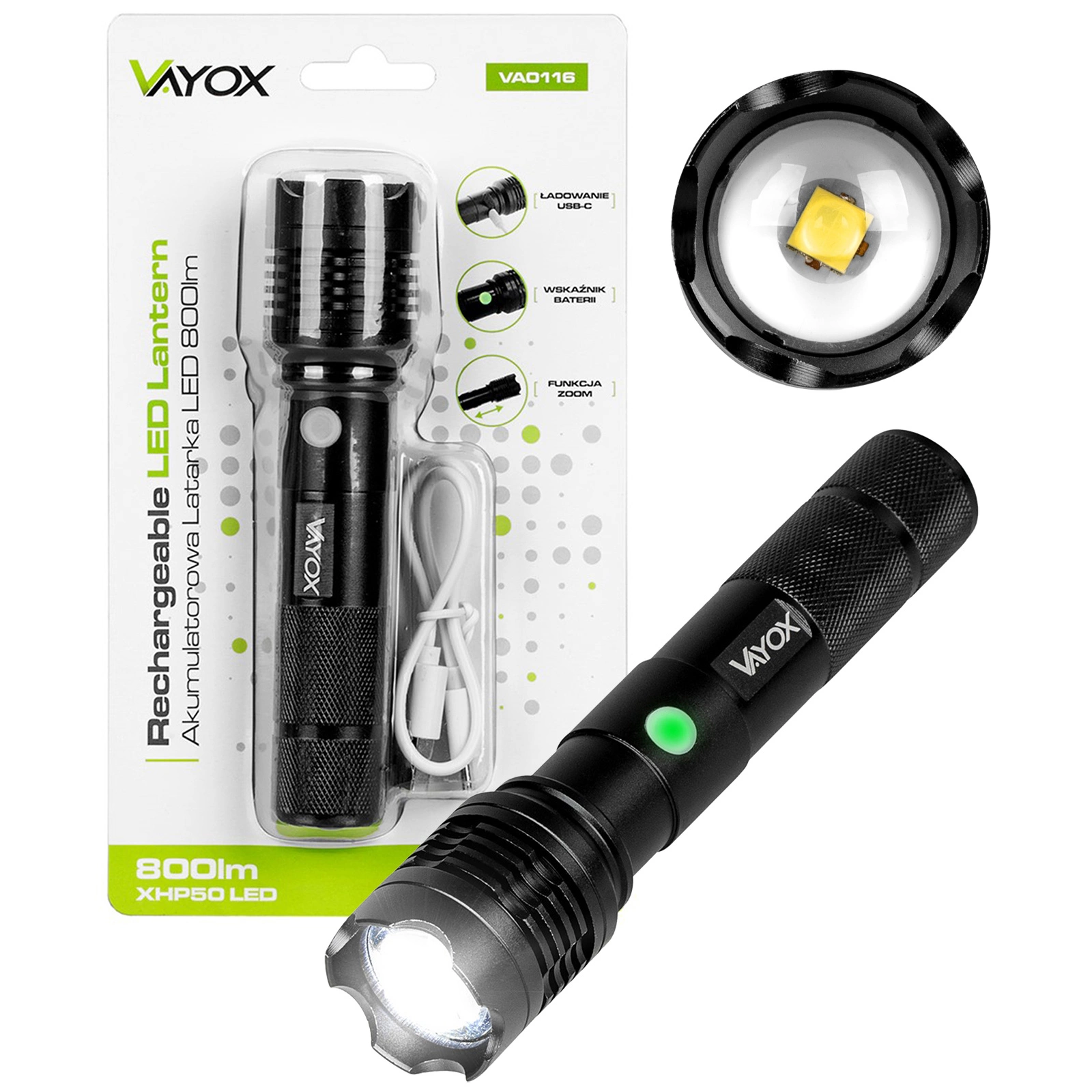 Taktická ruční svítilna Výkonná XHP50 800lm ZOOM USB-C VA0116 Vayox