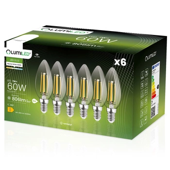 6x Žárovka LED Svíčka B35, E14 7W = 60W 806lm 4000K Neutralní bílá 360° Filament LUMILED