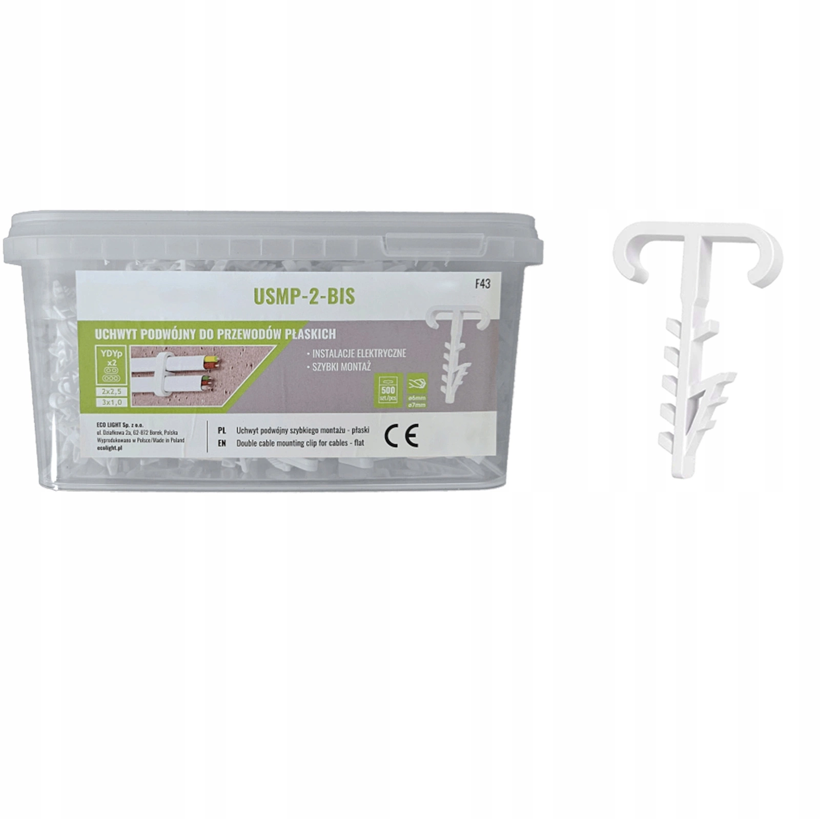 Použití: Dvojitý držák pro ploché kabely 2x YDYp 2x2,5 a 3x1,0, průměr vrtáku Ø 6-7.