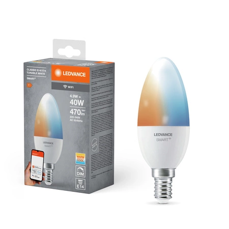 Objevte novou kvalitu osvětlení s inteligentní LED žárovkou Ledvance E14 ve tvaru svíčky. S příkonem 4,9 W zajišťuje úsporu energie a zároveň generuje světelný tok 470 lm. Užijte si možnost změny barvy světla(CCT) a pohodlí funkce stmívání WiFi, která přizpůsobí osvětlení každé situaci.