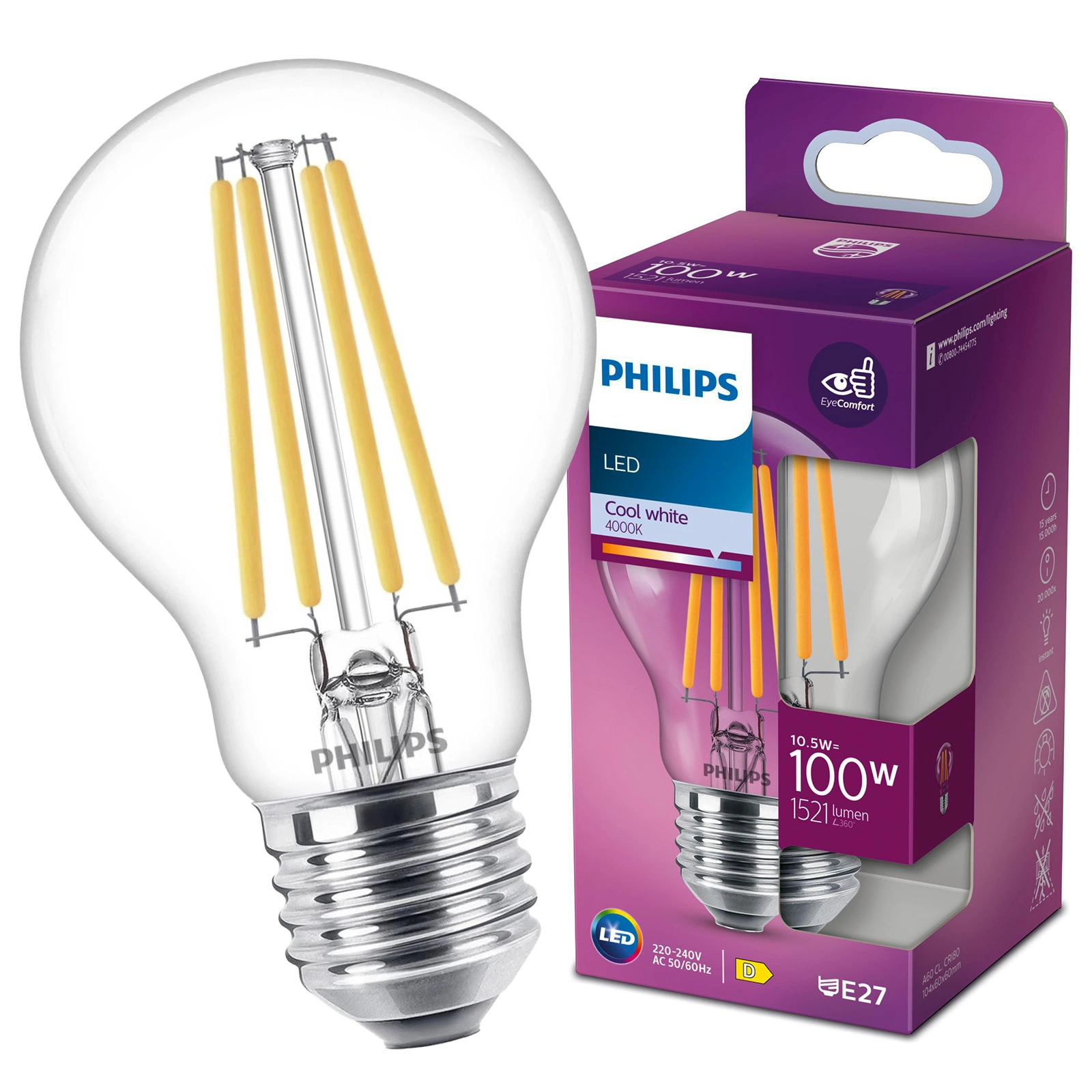 LED žárovka Philips poskytuje neutrální bílé světlo, výjimečnou odolnost a okamžité výrazné snížení spotřeby energie. Díky neutrální teplotě barev připomínající denní světlo je výbornou volbou světla do práce a dobře poslouží jako celkové osvětlení v interiéru. Neutrální světlo je také často instalováno v kancelářských místnostech, stejně jako ve veřejných budovách a skladech.