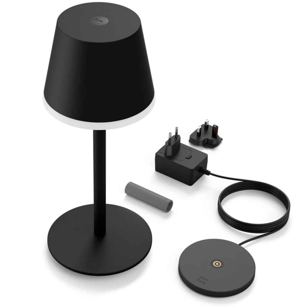 Hlavní výhodou produktu je možnost ovládat jej prostřednictvím jednoduché mobilní aplikace s funkcí Bluetooth k dispozici pro Android a IOS, pomocí kterého lze ovládat až deset světelných bodů. Další výhodou předloženého výrobku je, že jej lze ovládat pomocí Hlasových asistentů jako např Amazon Alexa, Google Assistant, Apple HomeKit a Microsoft Cortana, abyste mohli jednoduchými hlasovými příkazy pohodlně ovládat světlo v místnosti. Produkt Philips Hue lze připojit k Hue Bridge (prodává se samostatně), tím získáte přístup ke všem funkcím inteligentního osvětlení a možnost ovládat až 50 světelných bodů současně. Pomocí tlačítka na lampě můžeme přepínat mezi speciálními světelnými efekty a užívat si světla až 48 hodin - stačí ji nabít v bytě na dodané základně.