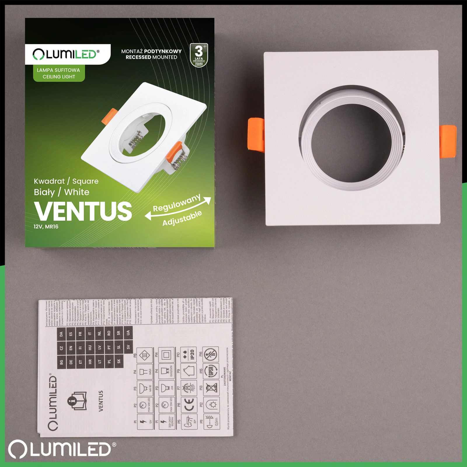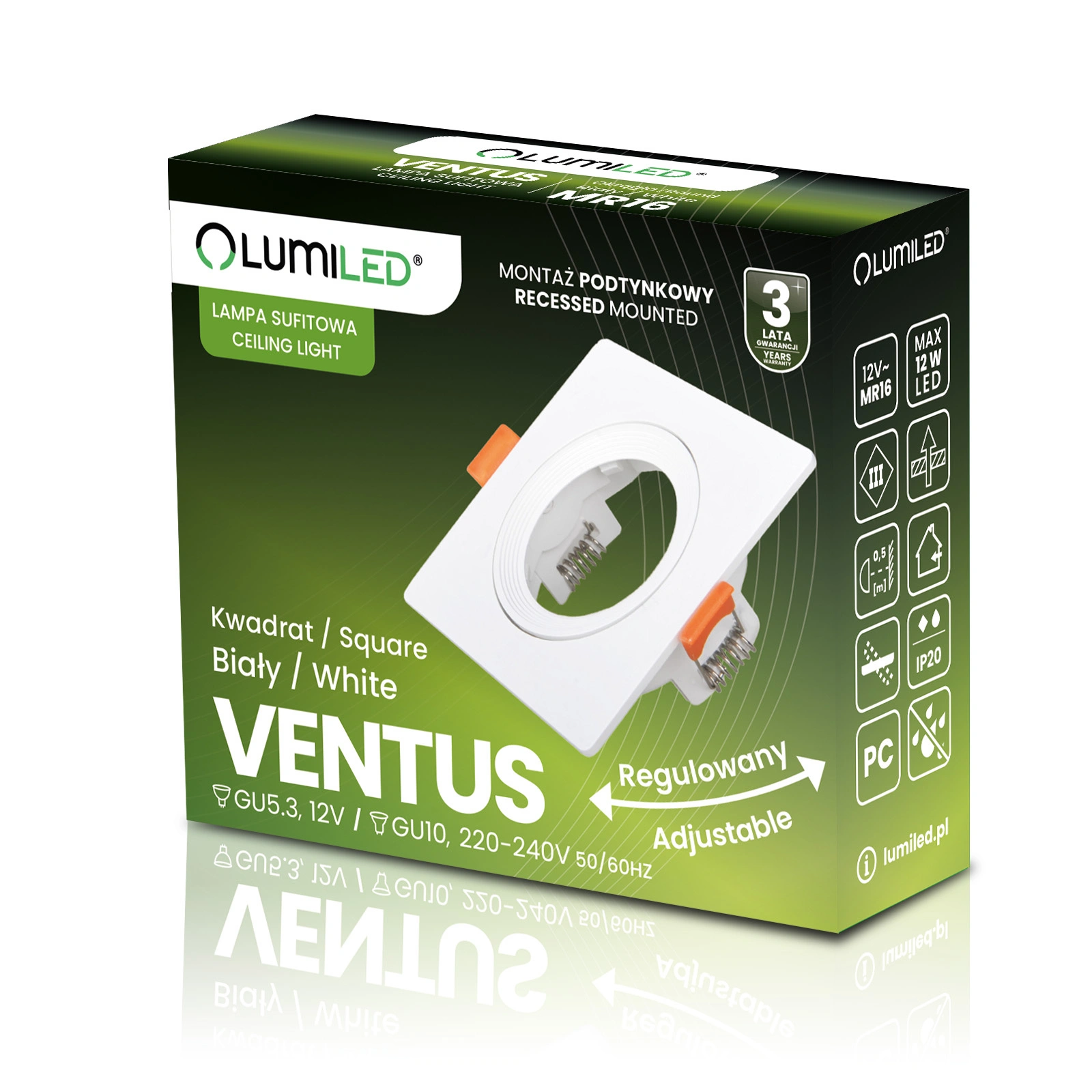 Čtvercová halogenová žárovka VENTUS v bílé barvě značky Lumiled je vyrobena z vysoce kvalitního plastu. Svítidlo bylo uzpůsobeno pro zapuštěnou montáž a je vybaveno pohyblivým vnitřním kroužkem , díky kterému snadno upravíme úhel svícení svítidla .