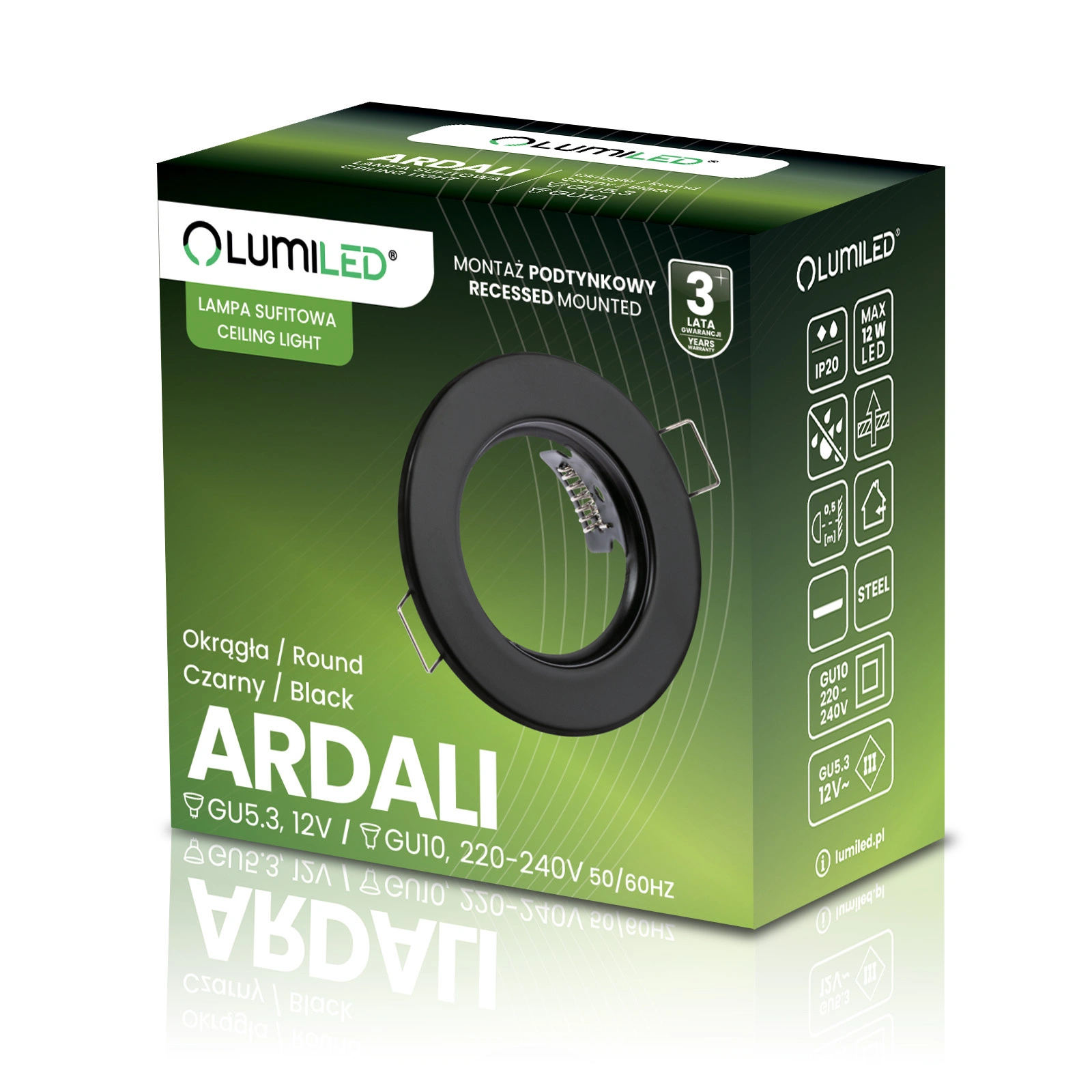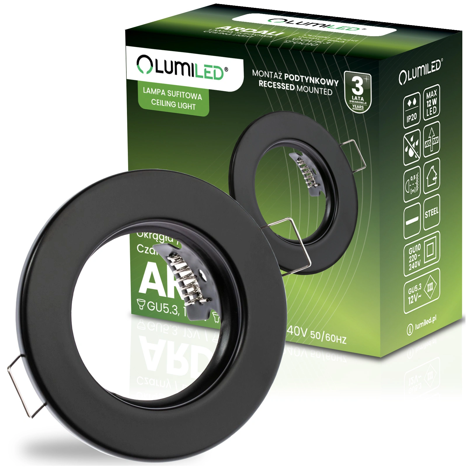 Kulaté pevné halogenové svítidlo v černé barvě od Lumiled je vyrobeno z vysoce kvalitní oceli . Svítidlo je uzpůsobeno pro zapuštěnou montáž, v kombinaci s dobrou LED žárovkou lze použít pro dekorativní osvětlení i pro celkové osvětlení ve větších otevřených místnostech, kde se použití jednoho světelného zdroje ukazuje jako nedostatečné a díky svému modernímu vzhledu najde uplatnění v každé moderně zařízené místnosti, bytech, domech nebo elegantních kancelářích.
