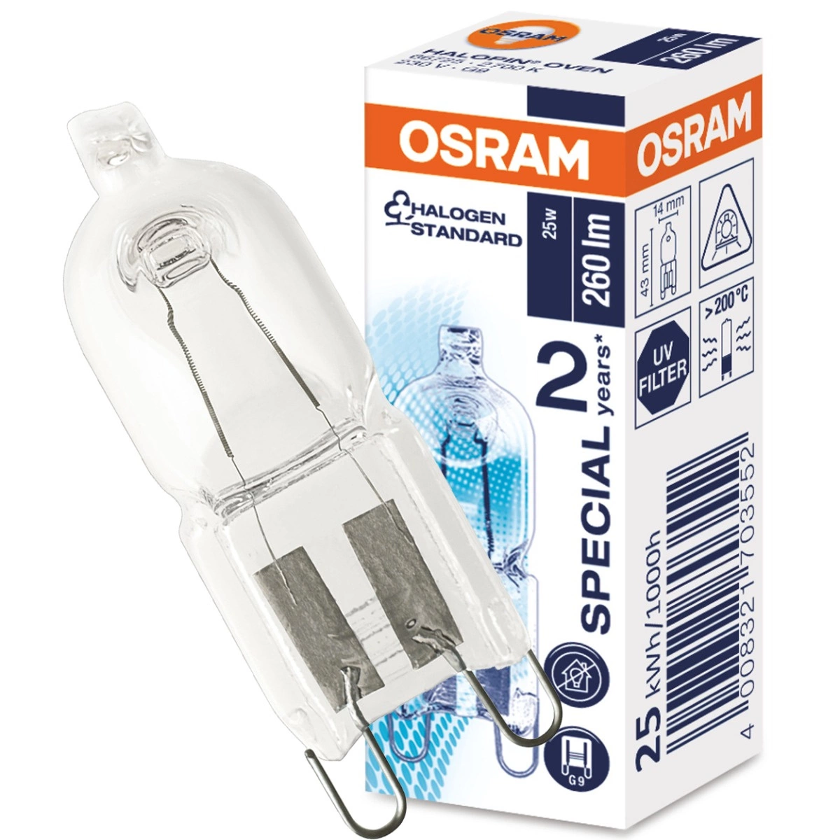 Žárovka HALOPIN OVEN CAPSUŁKA G9 230.V od renomované a uznávané firmy OSRAM s paticí G9 a výkonem 25W , světelným tokem 260lm a teplou barvou světla 2700K je vysoce kvalitní světelný zdroj odolný vůči vysokým teplotám. Je ideální pro místa, jako jsou trouby nebo jiné lampy pracující při vysokých teplotách. Kapsle byla vyrobena pomocí roztoků s použitím filamentu a skla, které se vyznačují vysokou teplotní odolností.