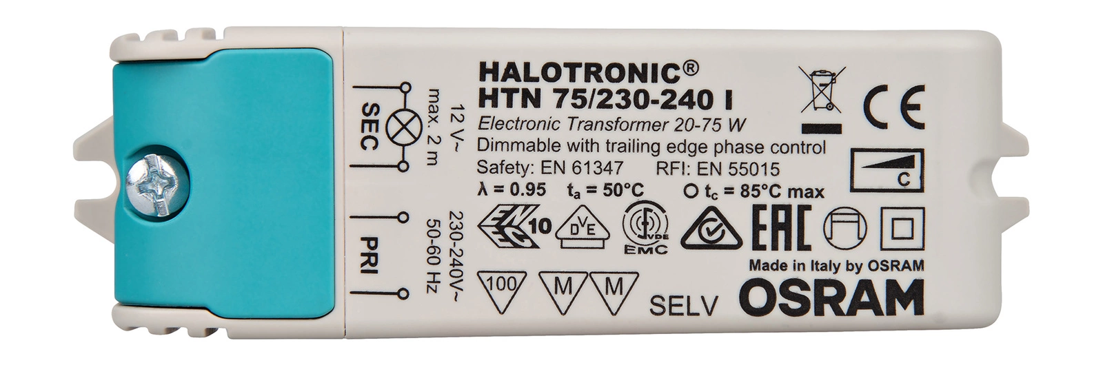 Konstantní napětí halogenové napájení HALOTRONIC 75/230-240 by OSRAM určené pro volnou instalaci nebo zabudování do svítidla.