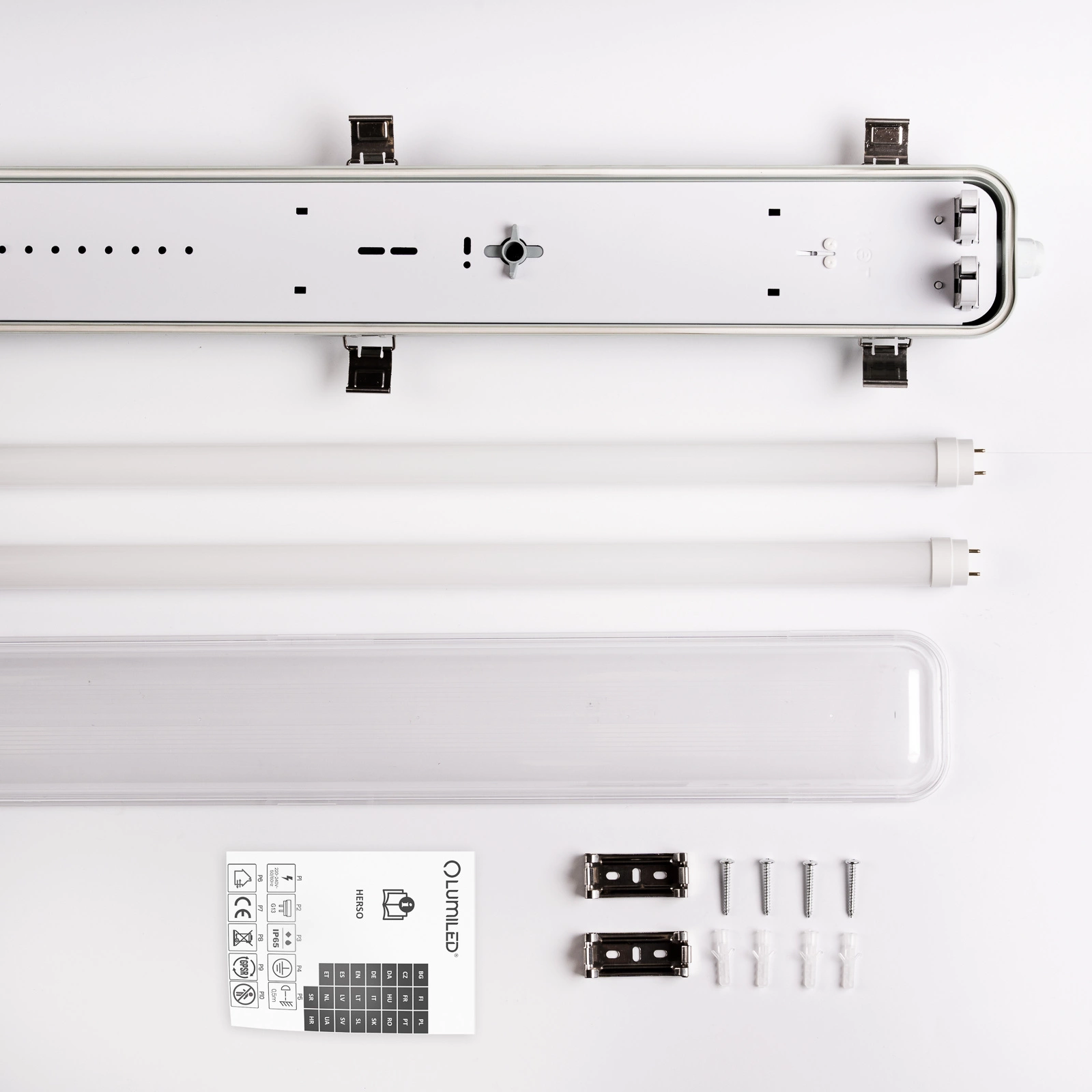 Hermetické svítidlo značky LUMILED vyrobené z vysoce kvalitního plastu a kovu. Svítidlo s nasazenými LED zářivkami s vysokou světelnou účinností je perfektní kombinací inovativního, moderního a zároveň odolného světelného zdroje.