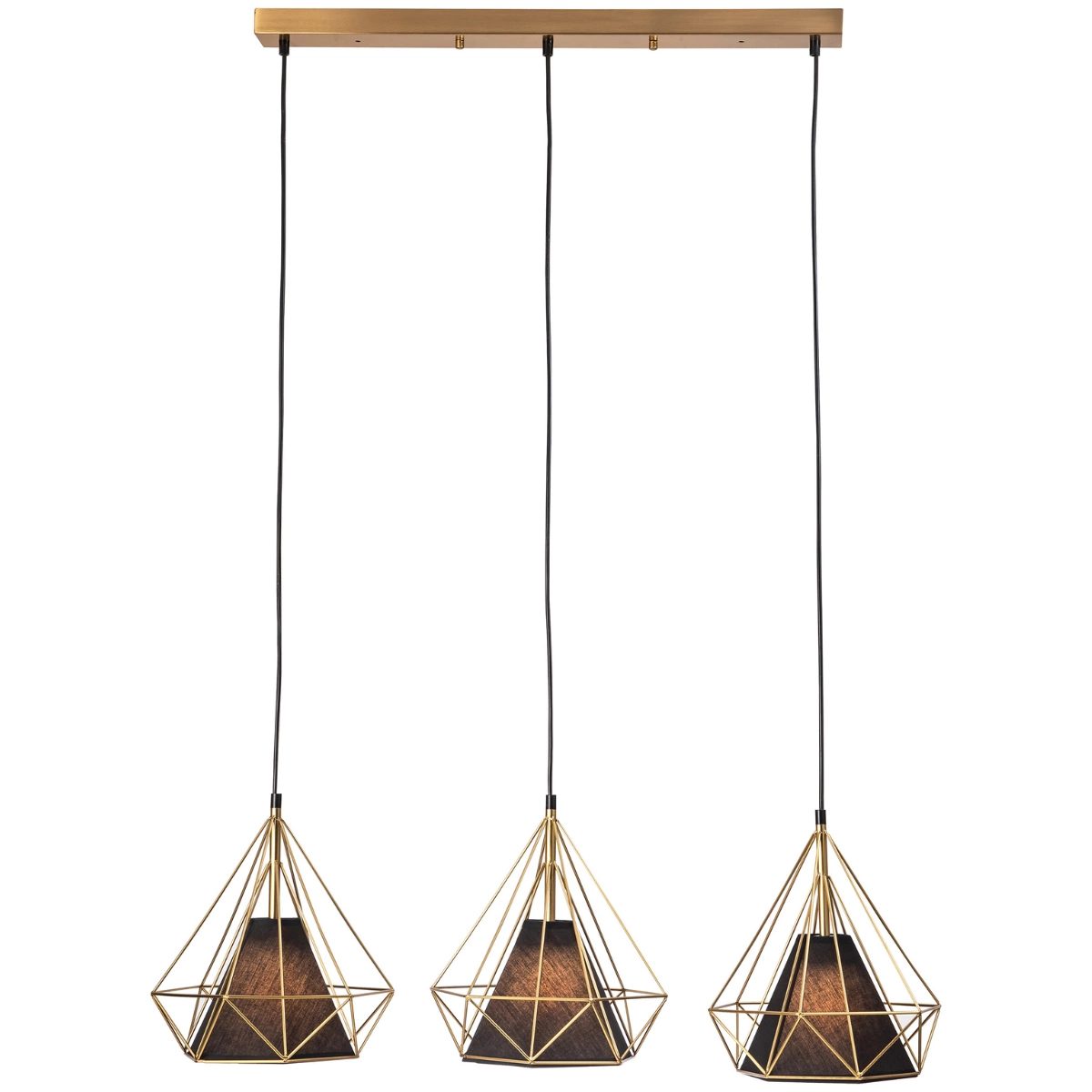 Závěsné svítidlo HIRA je univerzální závěsné svítidlo. HIRA je svítidlo určené do interiérů zařízených v moderním stylu. Dekorativní stínidla, jejichž tvar připomíná kombinaci geometrických obrazců, zdůrazňuje jednoduchost a minimalismus a černá barva dekorativní vnější části vytváří příjemný kontrast. Tento lustr se používá především jako hlavní osvětlení v obývacích pokojích, ložnicích, obývacích pokojích a kuchyních. Mimořádně originální a stylové závěsné svítidlo Hira je hitem osvětlení do módních půdních nebo industriálních prostor . Tři stínidla vyrobená z kovových tyčí zlaté barvy , vytvářející geometrický tvar připomínající leštěný diamant. Stínidla jsou vybavena objímkami s oblíbenou paticí E27 , která umožňuje použít v tomto lustru klasickou žárovku nebo LED žárovku . Délka převisu je nastavitelná , maximální délka svítidla se stínidlem je 1,4m.