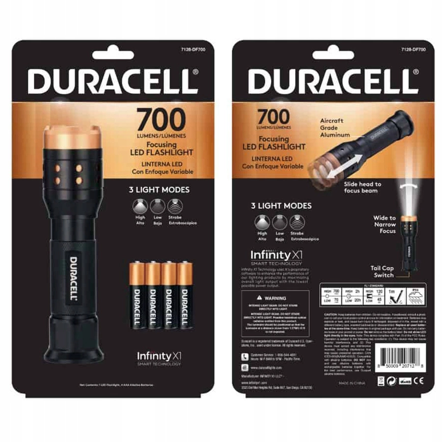 Svítilna Duracell Aluminium 700lm je spolehlivé svítidlo s působivým světelným tokem . Jeho pouzdro je vyrobeno z odolného hliníku, díky čemuž je mimořádně lehké a odolné proti poškození . Díky promyšlenému designu je na zadní straně pouzdra ergonomické tlačítko pro zapnutí/vypnutí , které zaručuje pohodlí při používání. Další výhodou je funkce Zoom , která vám umožňuje upravit světelný tok a přizpůsobit jej vašim individuálním potřebám.