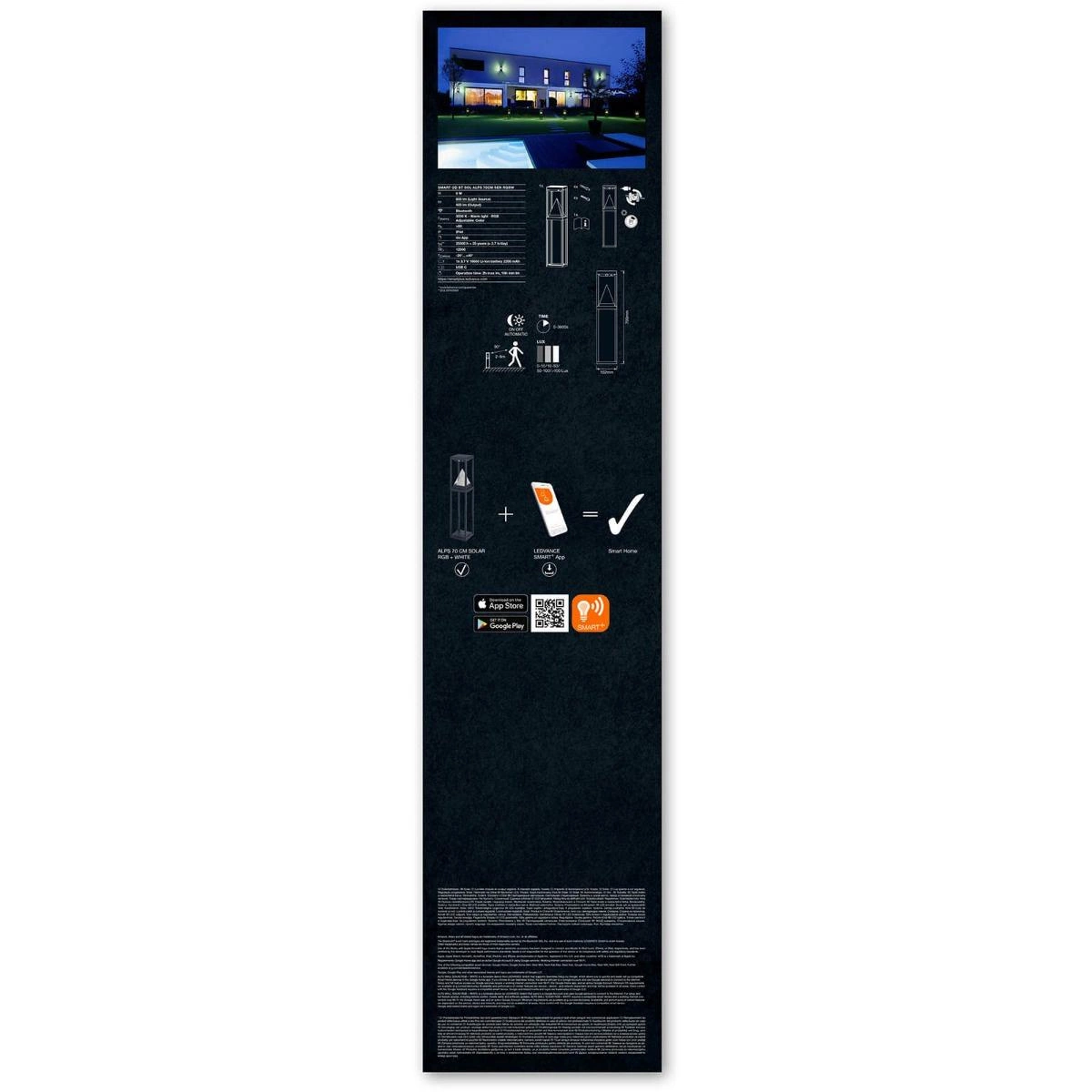 Inteligentní venkovní zahradní sloupek ze série SMART+ od renomované a ceněné společnosti LEDVANCE v oboru osvětlení . Prezentovaná lampa má širokou škálu možností. Stačí nainstalovat aplikaci ( pro Android: LEDVANCE SMART+ ) z obchodu Google Play nebo pro iOS: spusťte aplikaci Apple Home a je to! Vestavěný pohybový a světelný senzor zajišťuje úsporu energie a vysoký stupeň krytí IP44 umožňuje externí instalaci a zároveň se těší dlouhé životnosti díky solárnímu napájení. Pomocí kompatibilní aplikace můžeme měnit barvu světla (na výběr téměř 16 milionů barev) a upravovat jas díky možnosti stmívání. Aplikace vám umožňuje ovládat osvětlení, i když jste mimo domov, a když se vrátíte, automaticky rozsvítí světlo. Stožár 6W se světelným tokem 400lm dokonale zapadne do vašeho okolí.