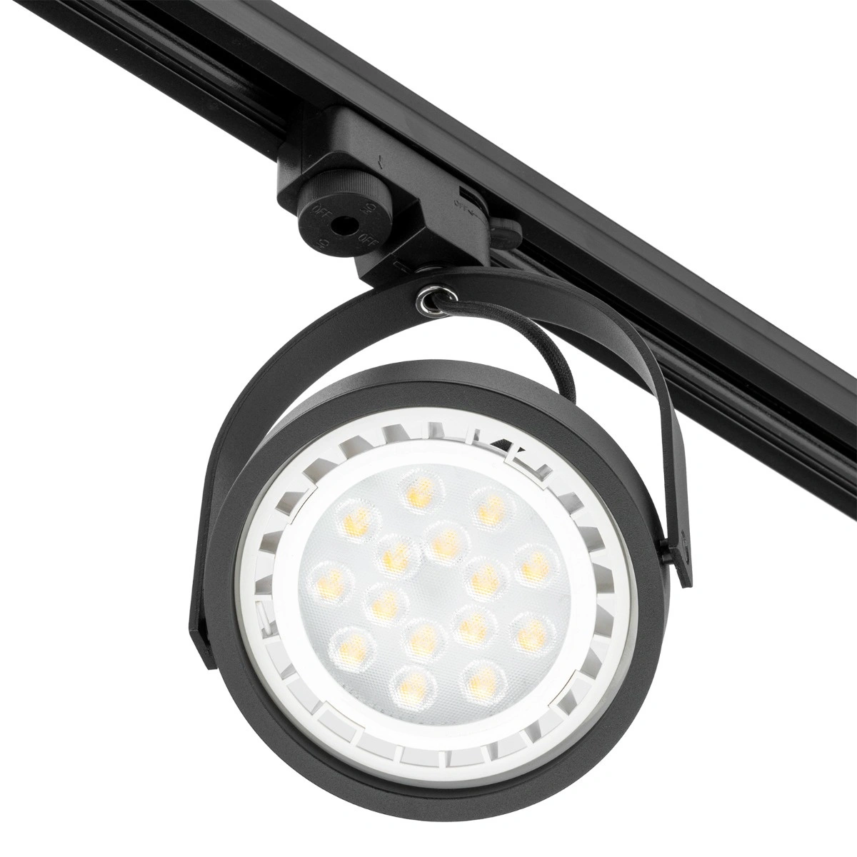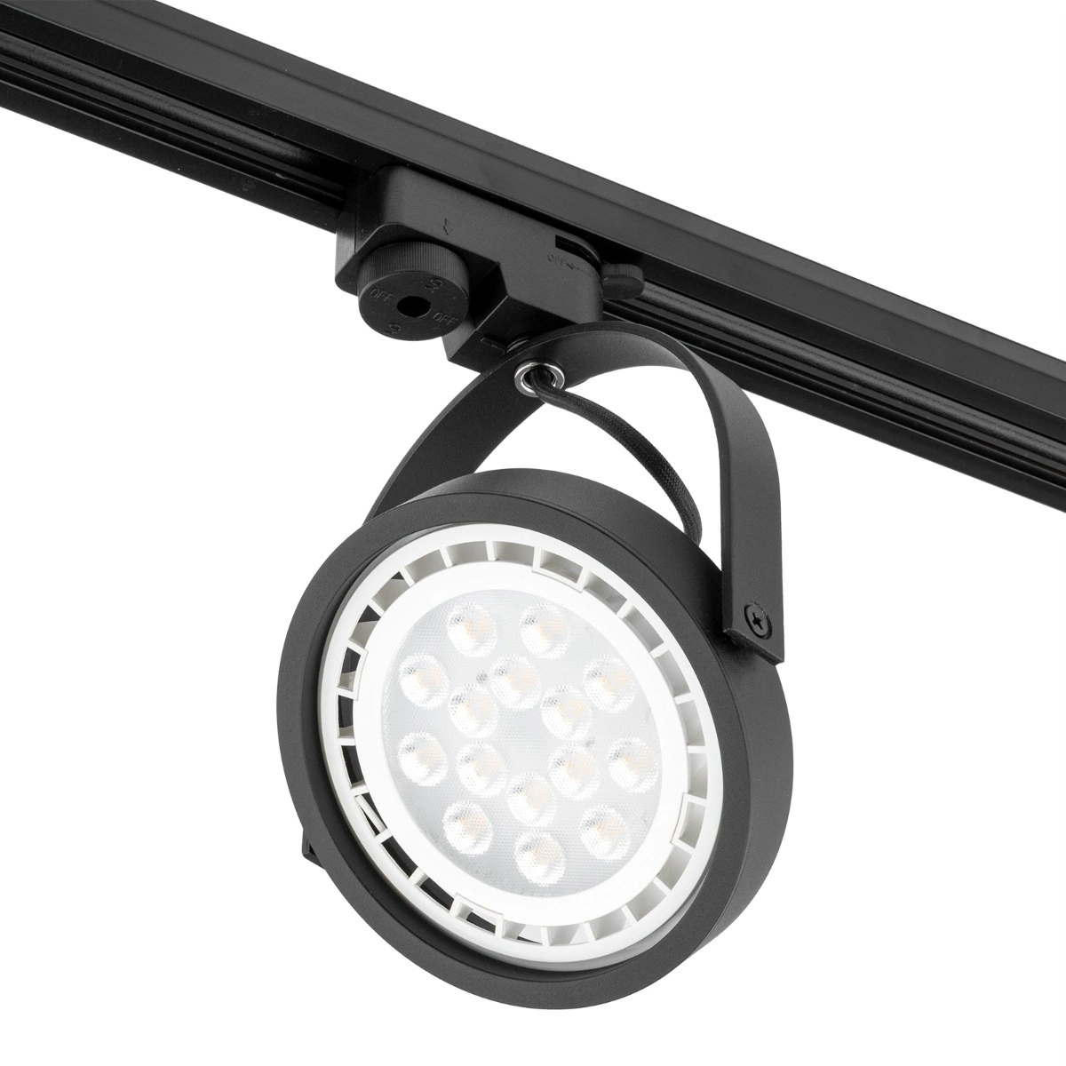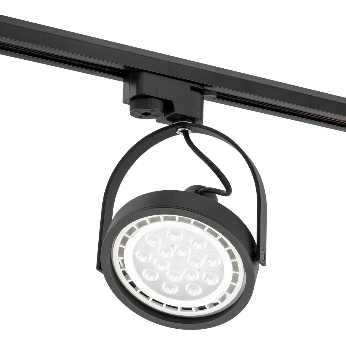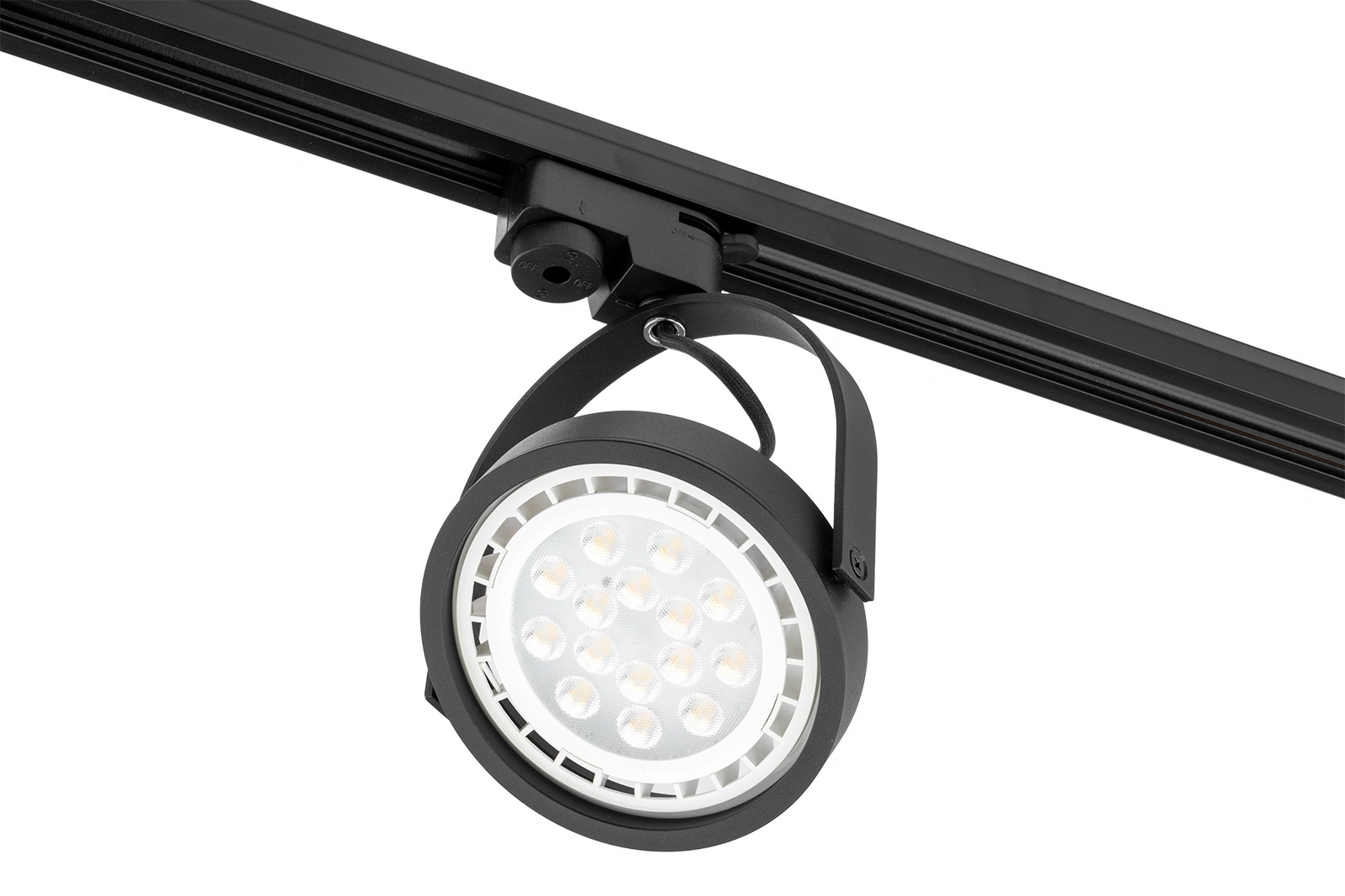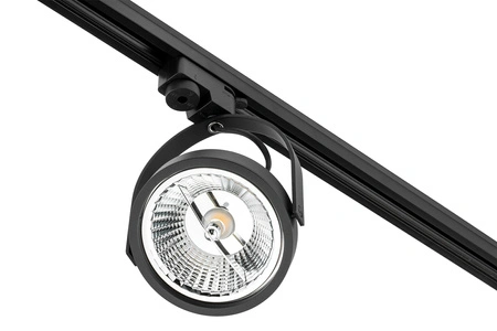 Černý kolejnicový reflektor s vyměnitelným světelným zdrojem s paticí GU10 . Lampa se žárovkou ES111 s úzkým úhlem svitu je ideální pro osvětlení míst jako je kancelář, chodba nebo výloha.