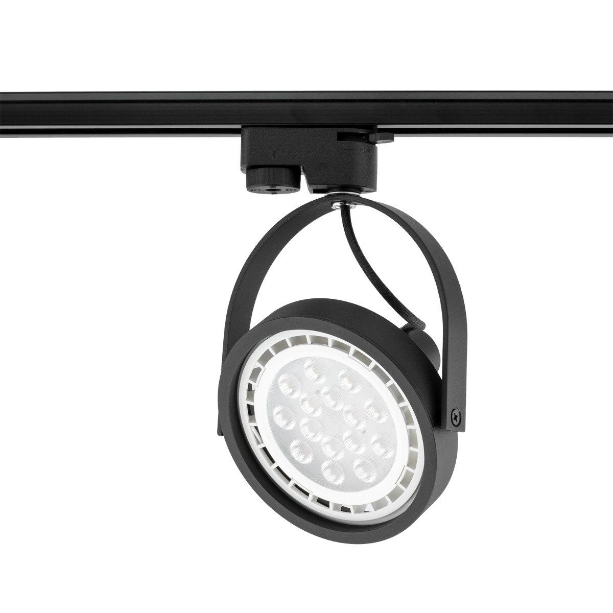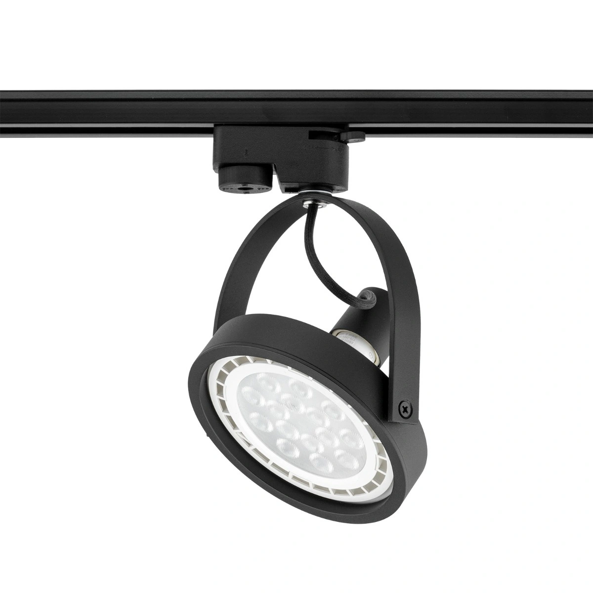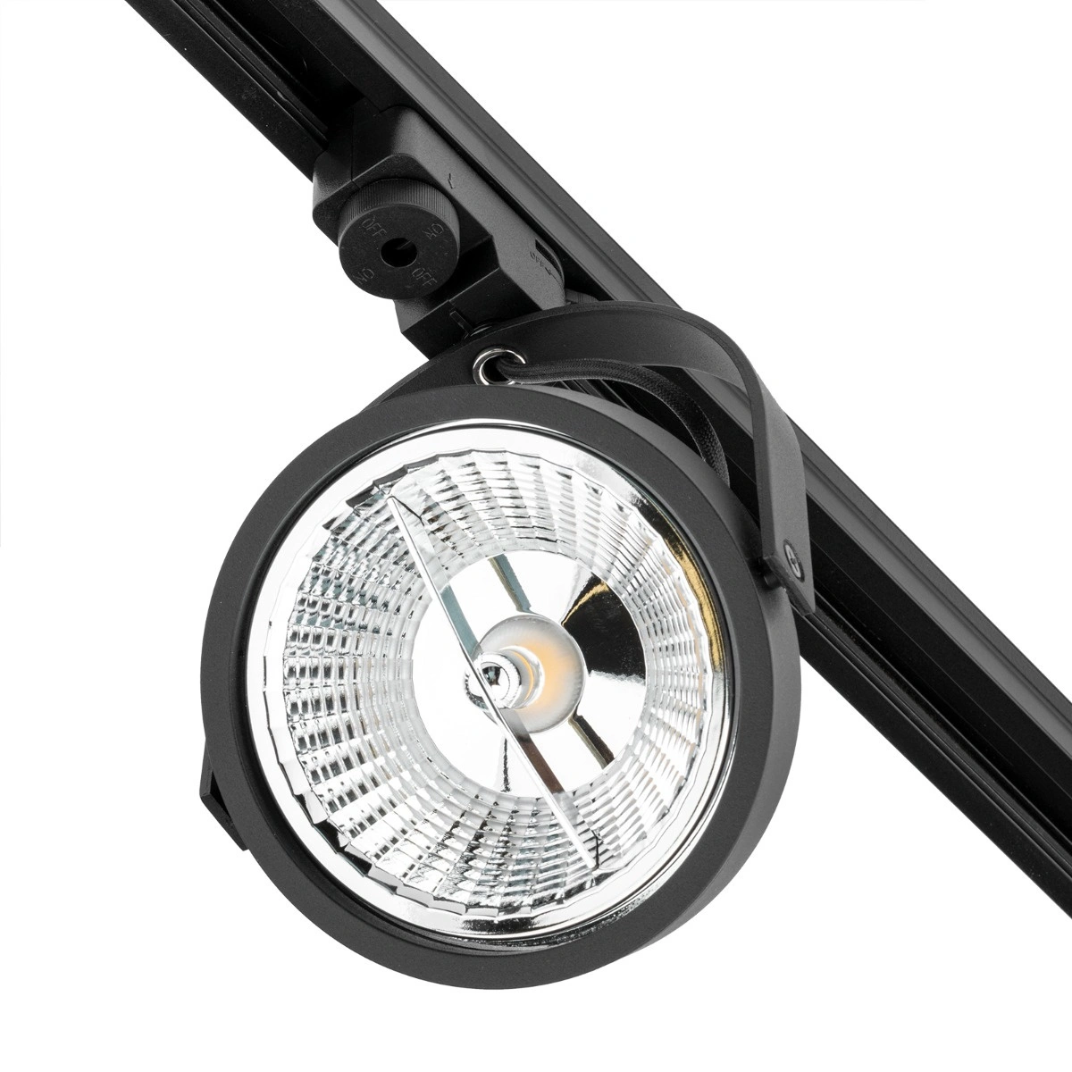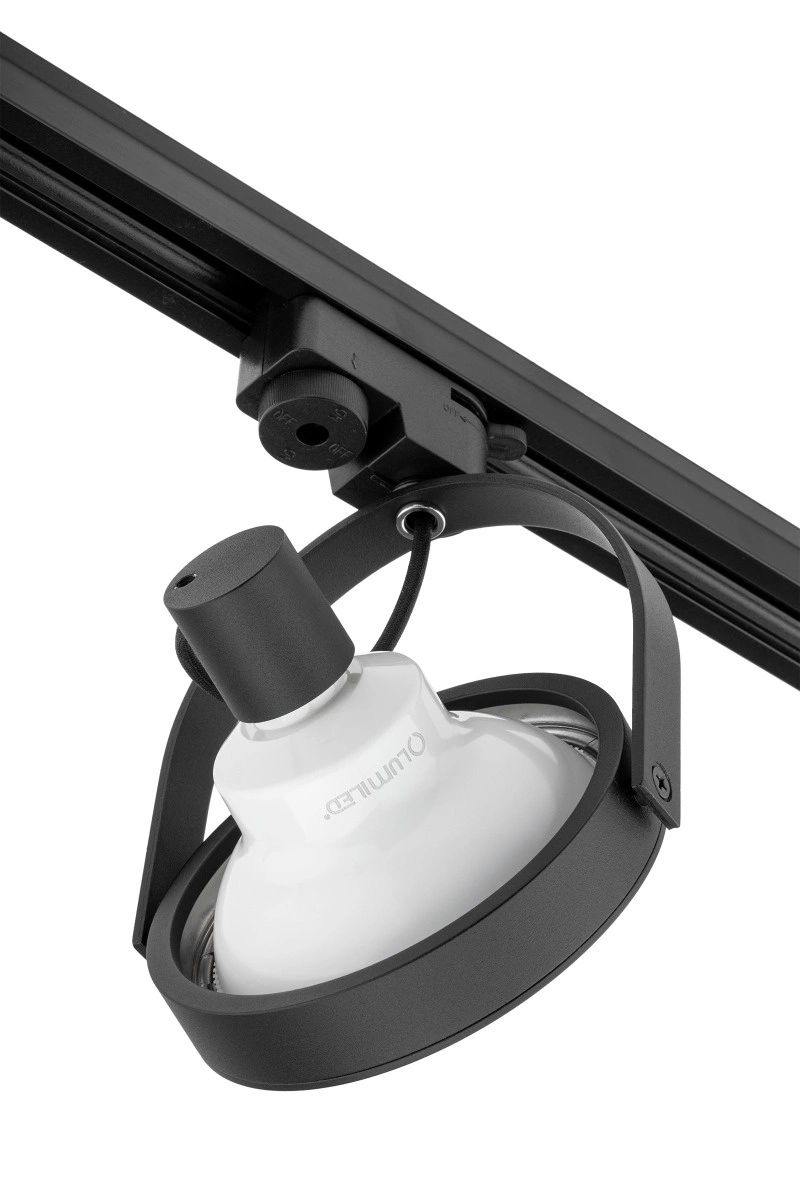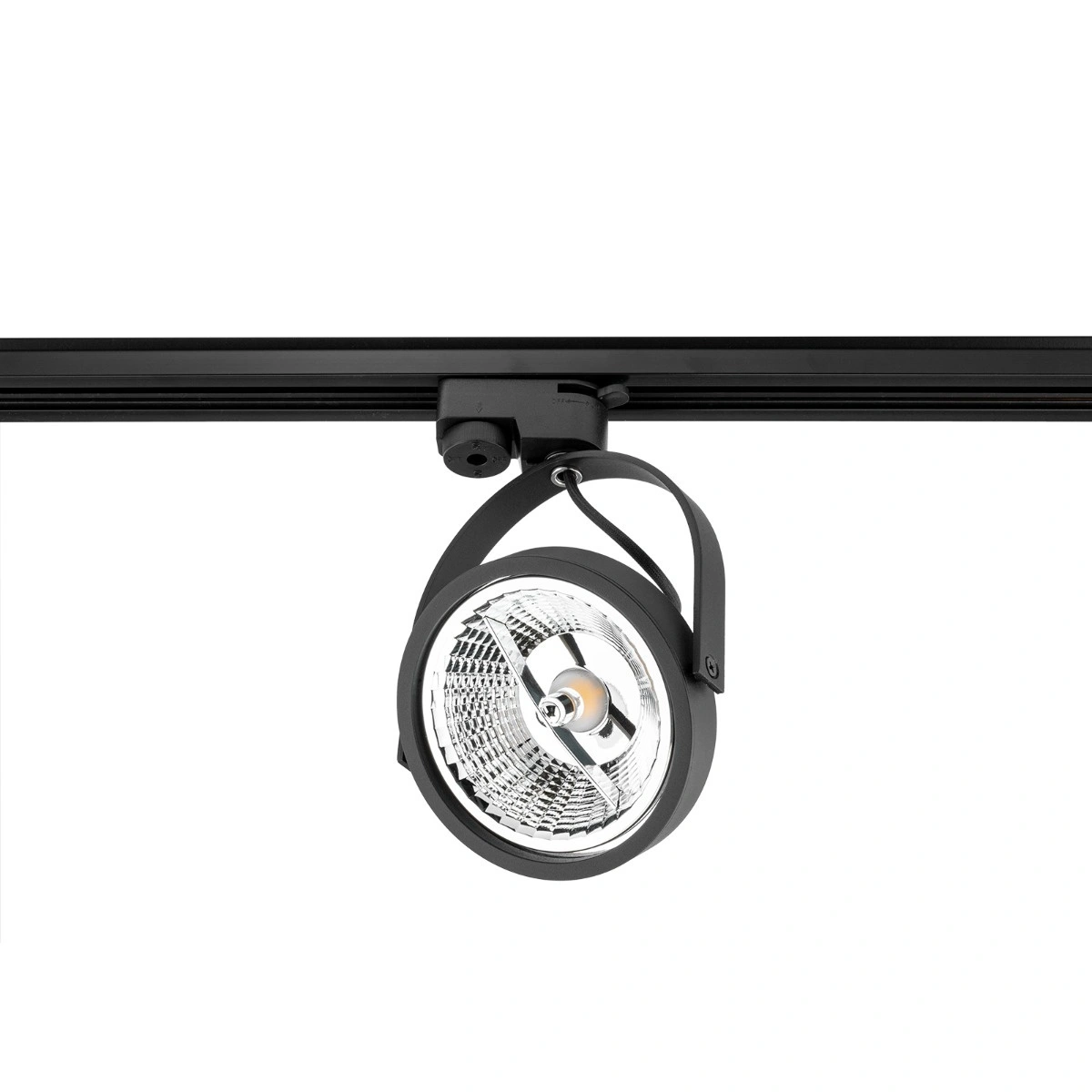 Černý kolejnicový reflektor s vyměnitelným světelným zdrojem s paticí GU10 . Lampa se žárovkou ES111 s úzkým úhlem svitu je ideální pro osvětlení míst jako je kancelář, chodba nebo výloha.