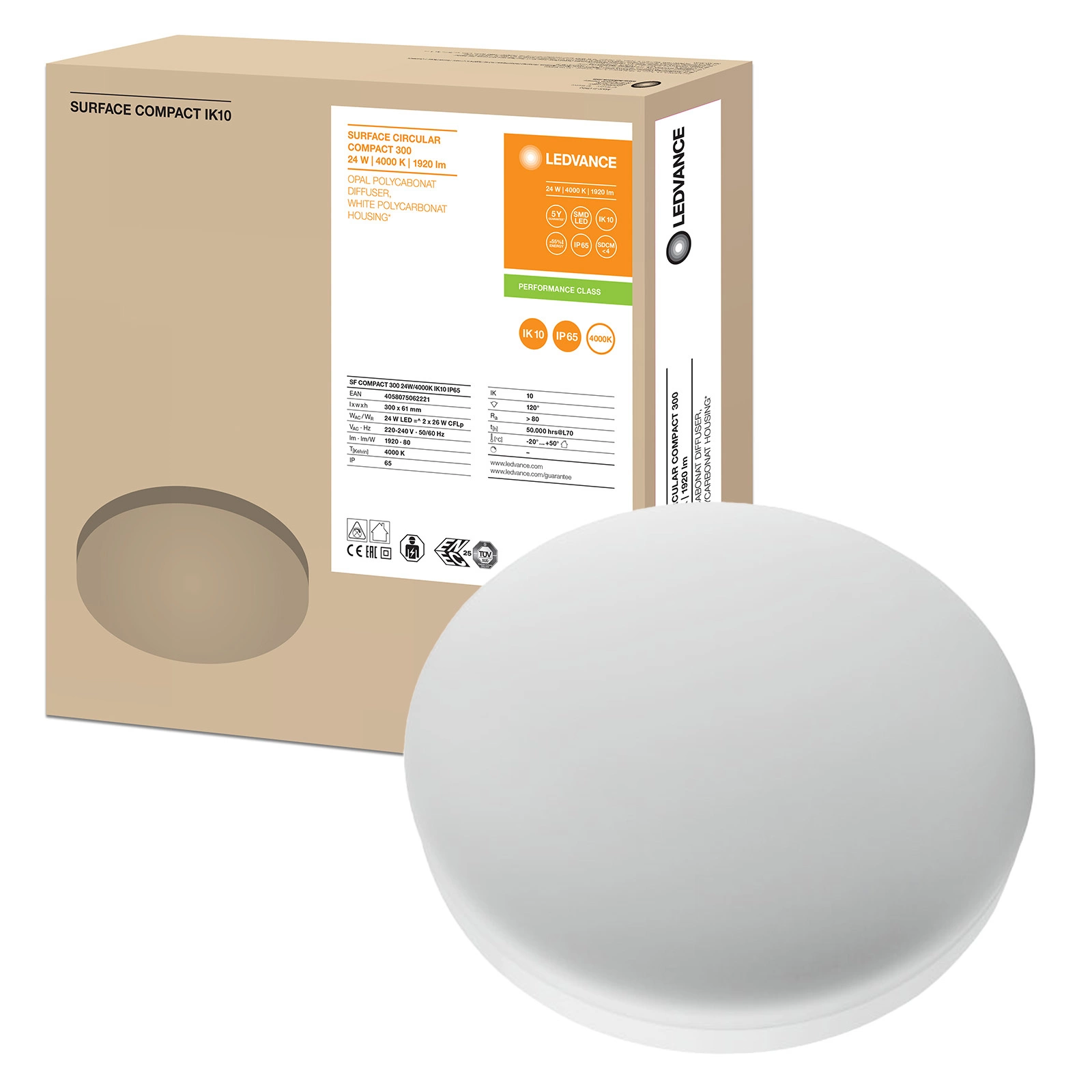 Svítidlo je vyrobeno z odolného polykarbonátového (PC) materiálu v bílé barvě, což zaručuje dlouhotrvající kvalitu a odolnost proti vodě a prachu IP65. Vyznačuje se nízkou spotřebou energie(24 kWh) a vysokou světelnou účinností 80 lm/W. Díky úhlu rozložení světla 120° je ideální pro nejrůznější prostory. Díky snadné povrchové montáži a absenci nutnosti výměny světelného zdroje je toto svítidlo funkčním a designovým doplňkem interiéru.