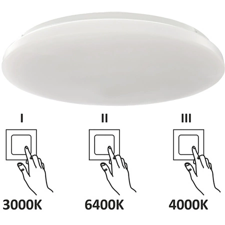 Stropní svítidlo má proměnnou barvu světla pomocí nástěnného vypínače v rozsahu od teplého 3000K, přes studené 6400K, až po neutrální 4000K.