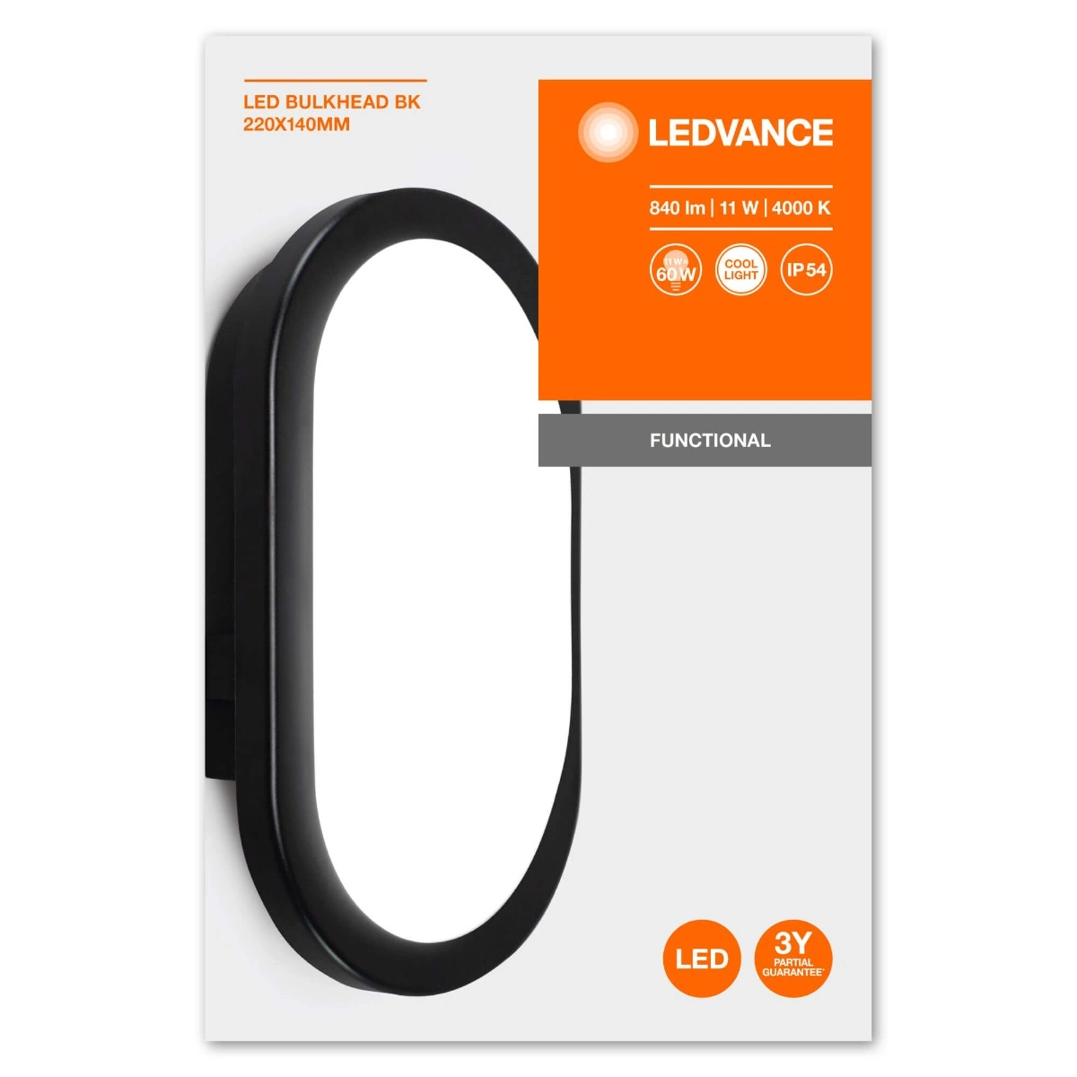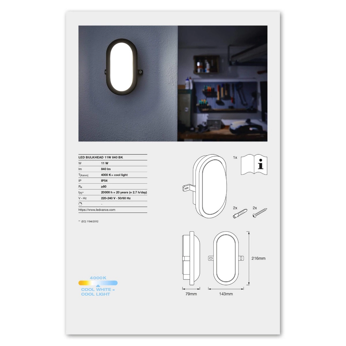 Vodotěsné, hermetické nástěnné svítidlo řada BULKHEAD renomovaná a uznávaná společnost v oboru osvětlení Ledvance. Barva lampy černá z vysoce kvalitního plastu se vyznačuje vysokou trvanlivostí a odolností vůči nepříznivým povětrnostním podmínkám. Svítidlo obsahuje integrovaný světelný zdroj LED, což je velmi energeticky efektivní až o 90 % nižší spotřeba energie než u jiných tradičních světelných zdrojů. Svítidlo s napájením 11W má vynikající světelné parametry se světelným tokem o hodnotě 800 lm, vyzařuje neutrální, pro uživatele příjemné, neoslňující světlo s barevnou teplotou 4000K. Lampa s mléčně bílým stínidlem se hodí téměř do každého interiéru a používá se především jako celkové osvětlení v menších vnitřních obytných prostorách se zvýšenou vlhkostí a jako venkovní osvětlení.