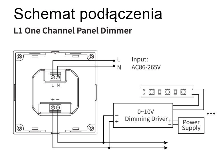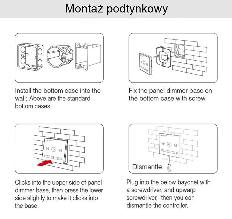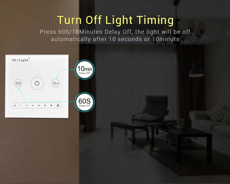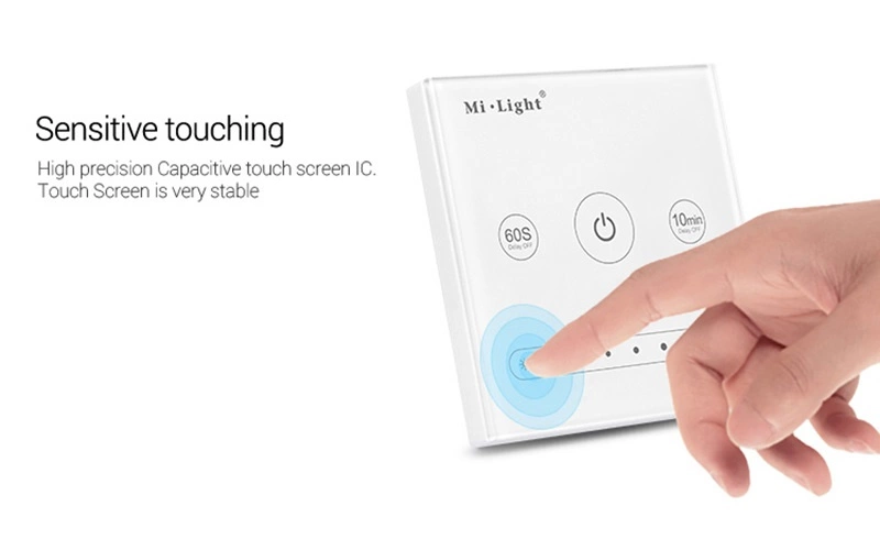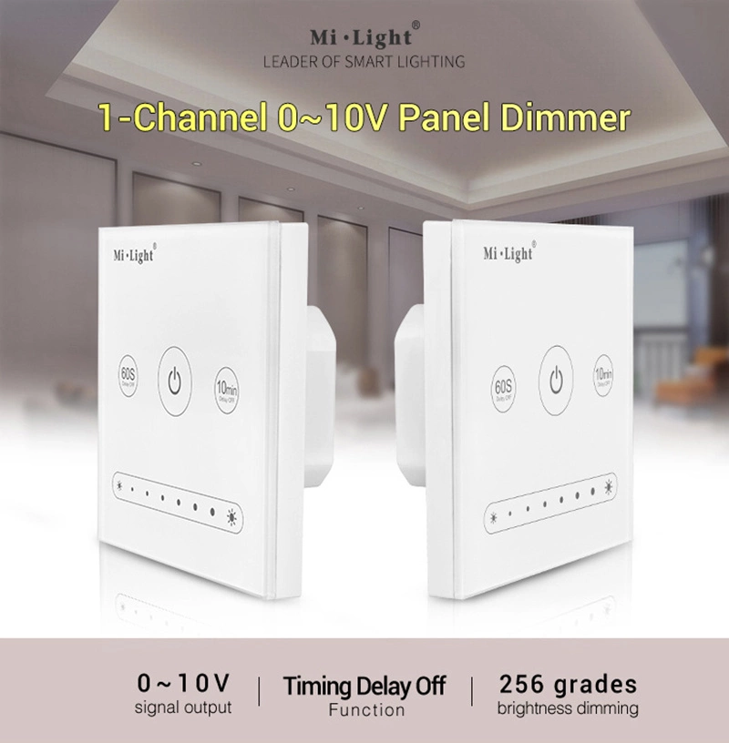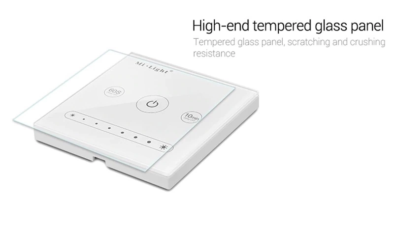 Nástěnný panel L1 Mi-Light namontovaný pod omítku se používá k ovládání všech produktů z řady 0/1~10V . Použití nástěnného panelu nám umožňuje plynule nastavit jas bílého světla. Panel je připojen k dalším produktům Mi-Light pomocí 2vodičového kabelu. Naše zařízení je napájeno AC180~240V , namontované v krabici pod omítku o průměru 60mm. Panel je vybaven doplňkovou funkcí zhasnutí světla po 60 sekundách, což nám dává možnost přesunout se na požadované místo před jeho zhasnutím.