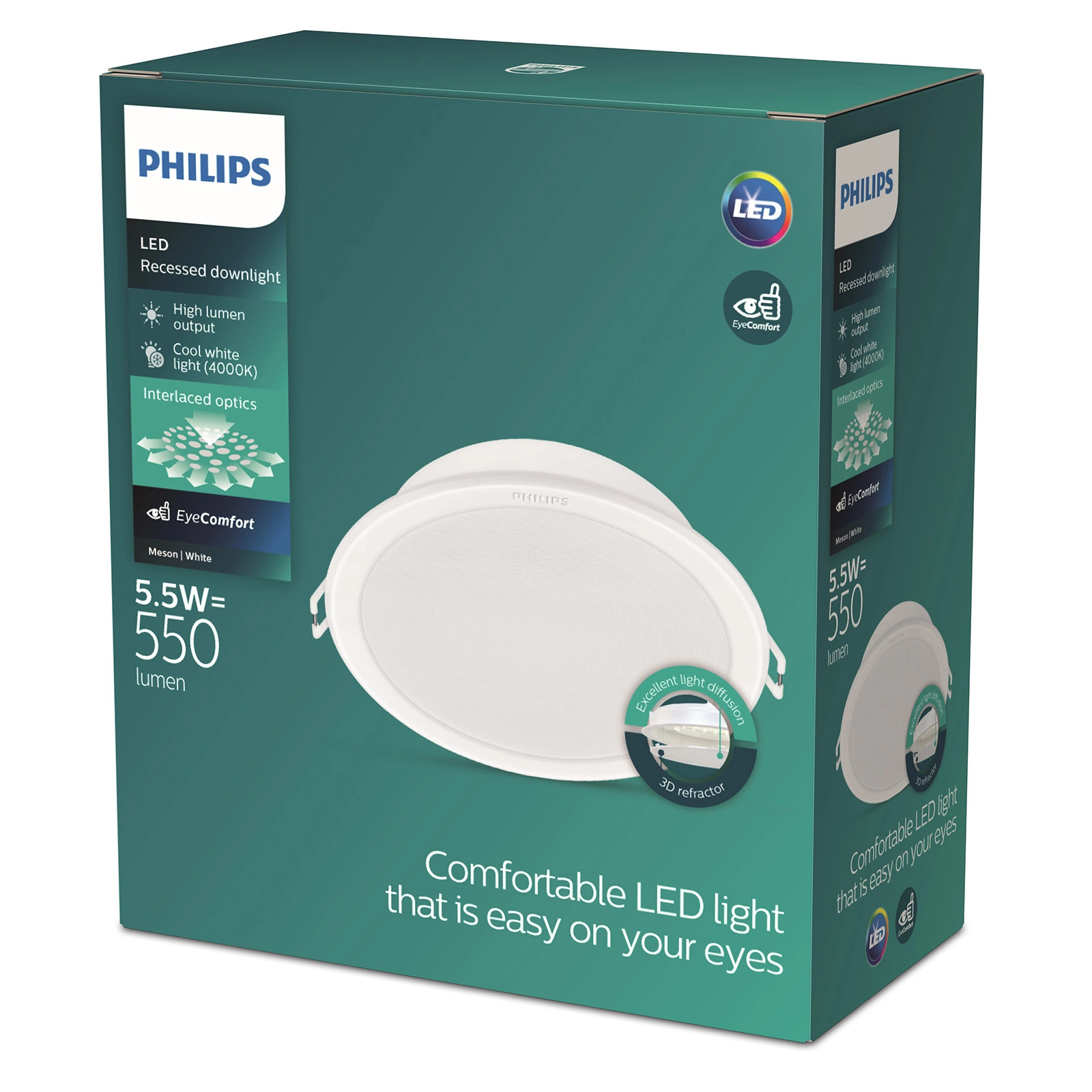 Philips Meson je elegantní vestavěné LED svítidlo, které kombinuje moderní design s výjimečnou funkčností. S výkonem 5,5 W a průměrem 90 mm je toto kompaktní svítidlo ideální pro různé místnosti, od obývacího pokoje až po kuchyň nebo chodbu. Díky neutrálnímu bílému povrchu se Meson harmonicky začlení do stropu, aniž by dominoval interiéru.