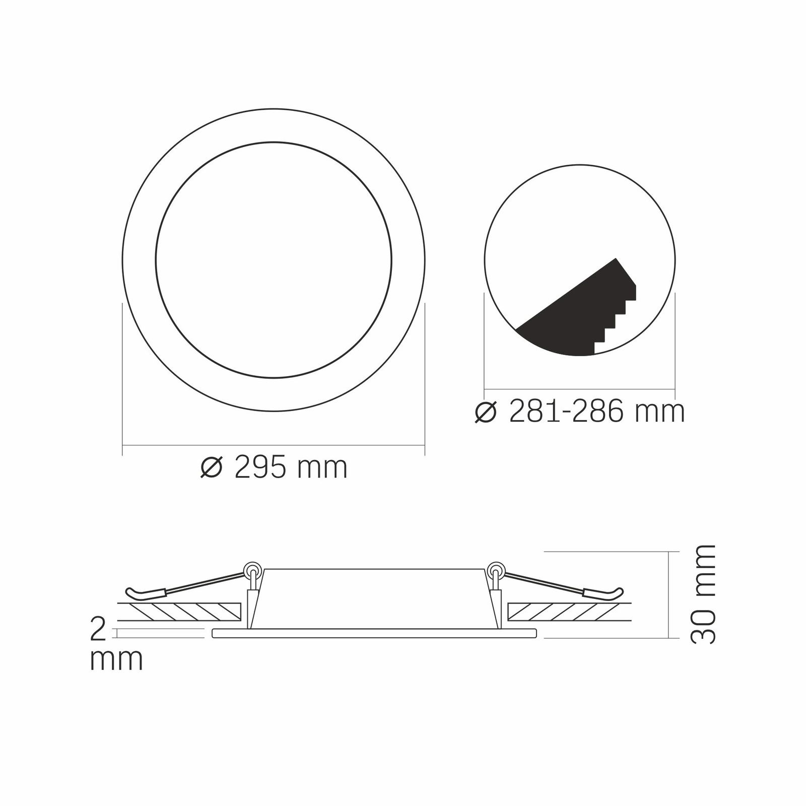 Životnost výrobku je působivých 30 000 hodin, což z něj činí vynikající investici na dlouhá léta dopředu. Úhel rozložení světla je 112 stupňů, což zajišťuje rovnoměrné osvětlení celé plochy. Rozsah provozních teplot -20 až +40 °C zaručuje spolehlivost v různých podmínkách. Jeho velikost (výška 28 mm, průměr 281 mm) umožňuje snadnou integraci do většiny stropů. Výrobek byl navržen s ohledem na minimalistický, moderní interiér. Použití tohoto svítidla představuje energeticky úspornou a ekologickou alternativu k tradičním světelným zdrojům.
