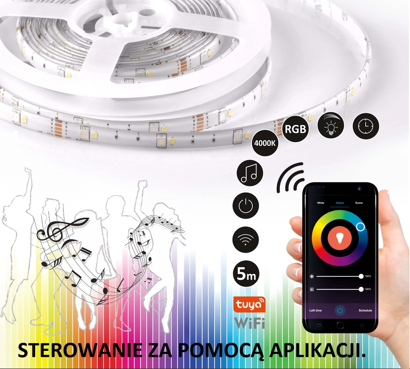 Díky aplikaci TUYA Smart můžeme ovládat mnoho funkcí: barvu světla, množství světla (stmívání), změnu barev a RGB scény. Je také možné naprogramovat automatické zapínání a vypínání. Pomocí Wi-Fi můžeme výše uvedené funkce snadno ovládat odkudkoli na světě za předpokladu, že náš ovládaný produkt je v dosahu naší domácí Wi-Fi sítě.