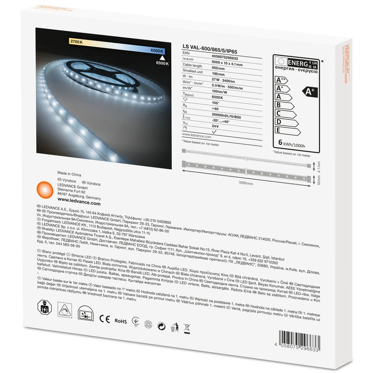Pružná páska, LED pásek o délce 5m a stupeň ochrany IP65 s obložením od renomované a uznávané osvětlovací společnosti Ledvance. LED pásek s napájením 27W, vysoká světelná účinnost (600lm/m) a vysoká odolnost. Páska vydává studený barva LIGHT s teplotou barev 6500K. Páska oboustranně drátované, takže popruhy lze snadno prodloužit na libovolnou délku. Další výhodou pásky je bezproblémový provoz se standardními stmívači, použití stmívače umožňuje nastavit sílu světla podle momentální situace. Pro vnitřní i venkovní použití se LED pásky používají především jako dekorativní osvětlení teras, schodišť, koupelen a podhledů.