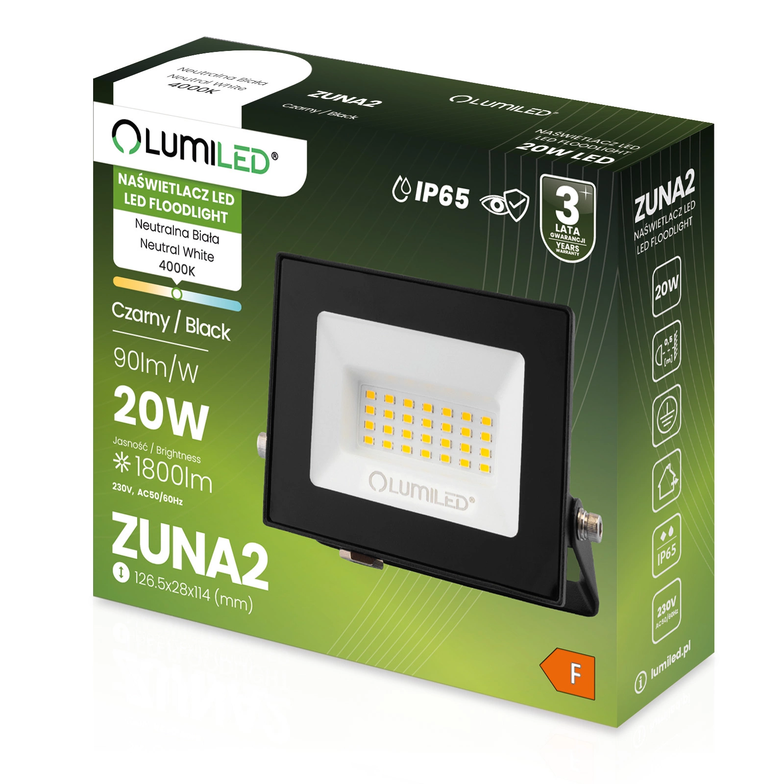 LED reflektor ZUNA2 je vybaven energeticky úsporným světelným zdrojem LED z 20W i neutrální světlá barva s barevnou teplotou 4000K poskytuje osvětlení na úrovni 1800 lm - světelný tok 90 lm/W.