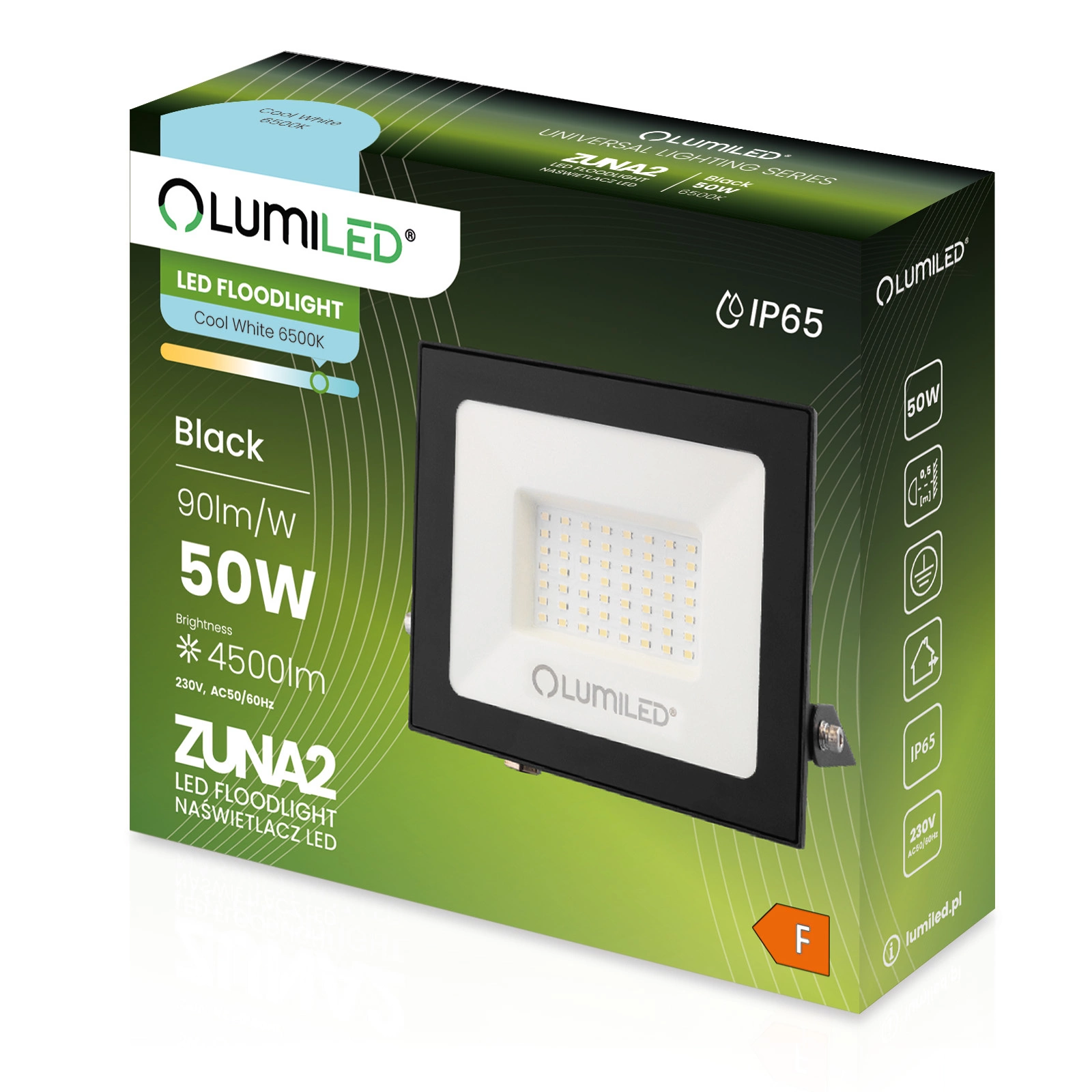 LED reflektor ZUNA2 je vybaven energeticky úsporným světelným zdrojem LED z 50W i barva studeného světla s barevnou teplotou 6500K poskytuje osvětlení na úrovni 4500 lm - světelný tok 90 lm/W.