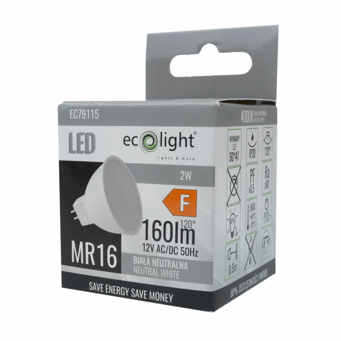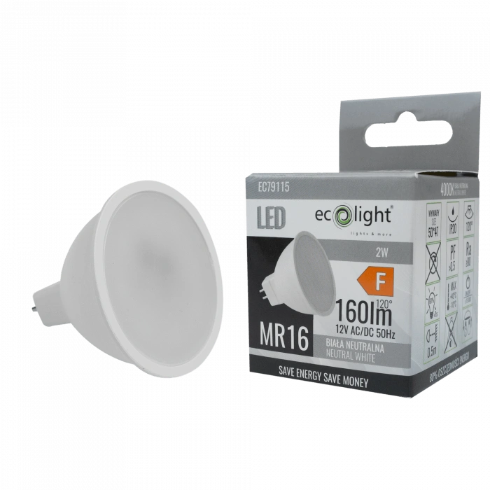 Osvěžte svůj prostor pomocí pokročilé technologie osvětlení s žárovkou LED Reflector MR16 GU5,3 od společnosti Ecolight. Jedná se o inovativní světelný zdroj, který kombinuje energetickou účinnost a vynikající kvalitu. Se jmenovitým příkonem 2 W a světelným tokem 160 lm poskytuje tato žárovka jasné, neutrální světlo s barevnou teplotou 4000 K. Je vynikající volbou pro domácí i komerční prostory a nabízí úhel rozložení světla 120°, který zajišťuje rovnoměrné rozložení světla.