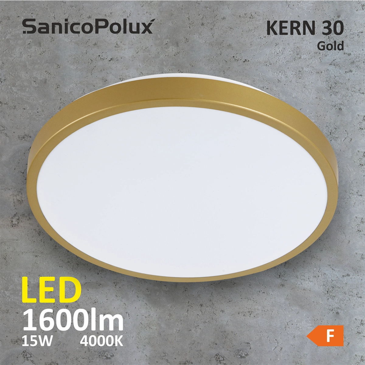 Moderní, kulatá LED PLATFORMA KERN od POLUX ve zlaté barvě s vysoce účinným, energeticky úsporným LED světelným zdrojem o výkonu 15W a světelném toku 1600lm. Lampa je vybavena LED diodami, které vrhají jemné odlesky a poskytují rovnoměrně rozptýlené světlo, čímž eliminují negativní vliv oslnění. LED diody použité ve svítidle zaručují jeho vysokou odolnost a vysokou světelnou účinnost, díky čemuž jediné kruhové stropní svítidlo snadno osvětlí středně velké místnosti. Navíc se díky svému designovému a minimalistickému vzhledu hodí téměř do každého interiéru.