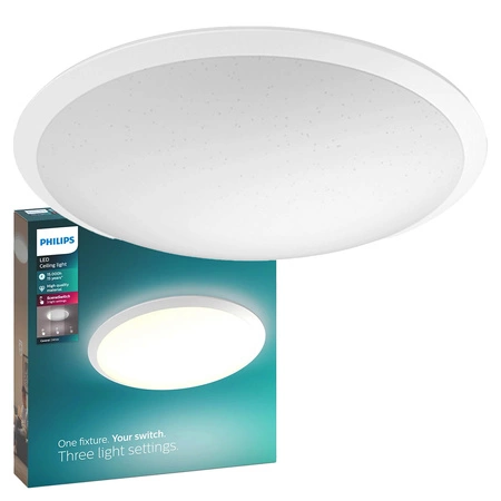 Stropní svítidlo Philips CAVANAL 40K je vybaveno funkcí SceneSwitch Brightness Change. Díky této funkci můžete upravit jas LED diod, aniž byste museli instalovat stmívač. Pomocí běžného vypínače světla můžete snadno přepínat mezi třemi úrovněmi jasu. Stojí za zmínku, že tato lampa není určena pro použití se stmívačem.