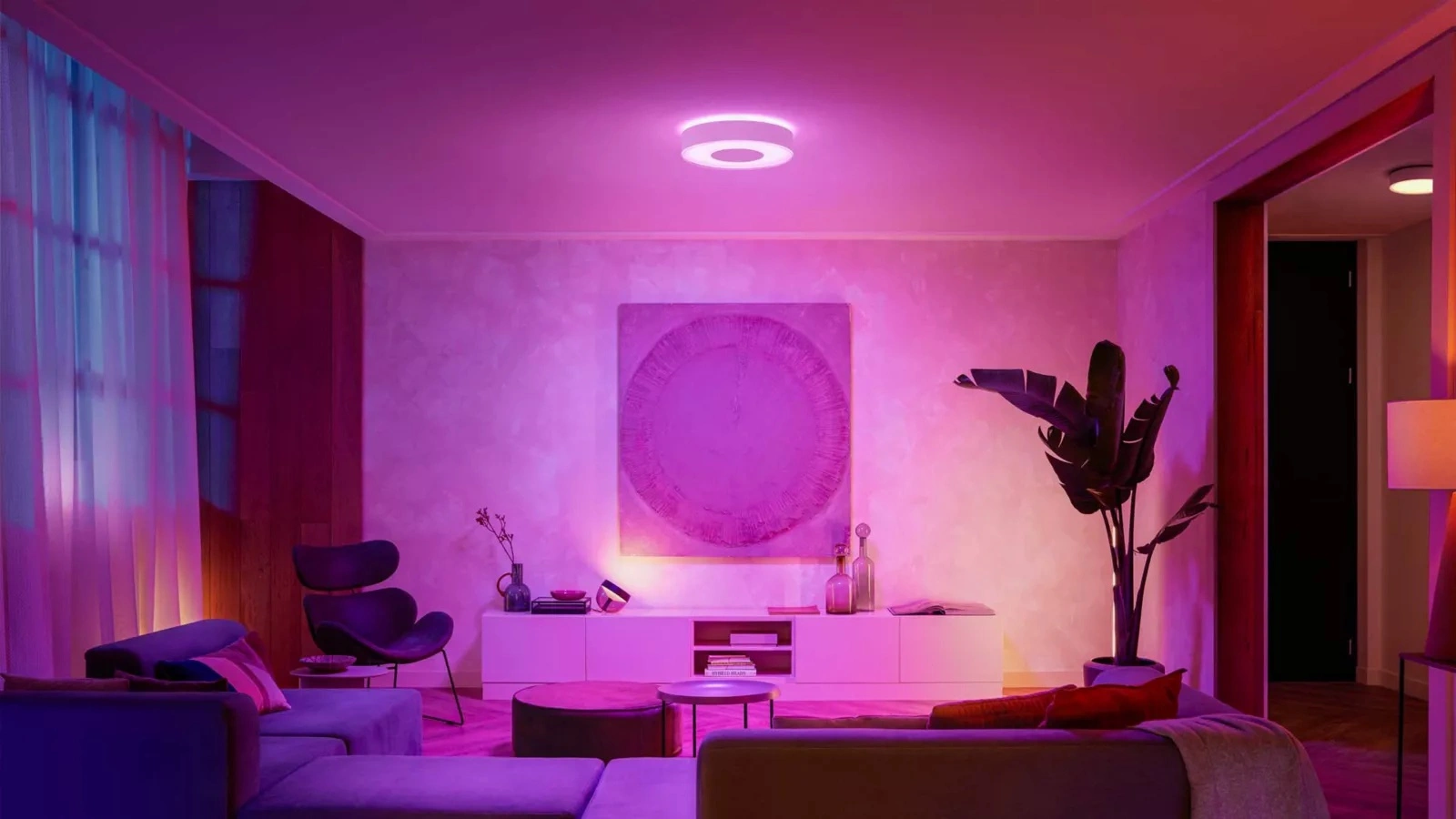 Stropní svítidlo HUE LED uznávaný a respektovaný v oboru osvětlení Philips. Svítidlo vybavené integrovaným světelným zdrojem LED 52,5W a velmi účinný světelný výkon - 3700 lm, vyzařuje teplé příjemné a relaxační světlo, s 16 milionů barev RGB i širokou paletu bílého světla, s nimiž můžeme vytvořit náladu vhodnou pro každou příležitost. Kromě regulace světla v celé škále barevné teploty má svítidlo také funkci okamžité stmívání. HUE Plafond jako barevný světelný akcent rozzáří místnost a každý prvek interiéru.