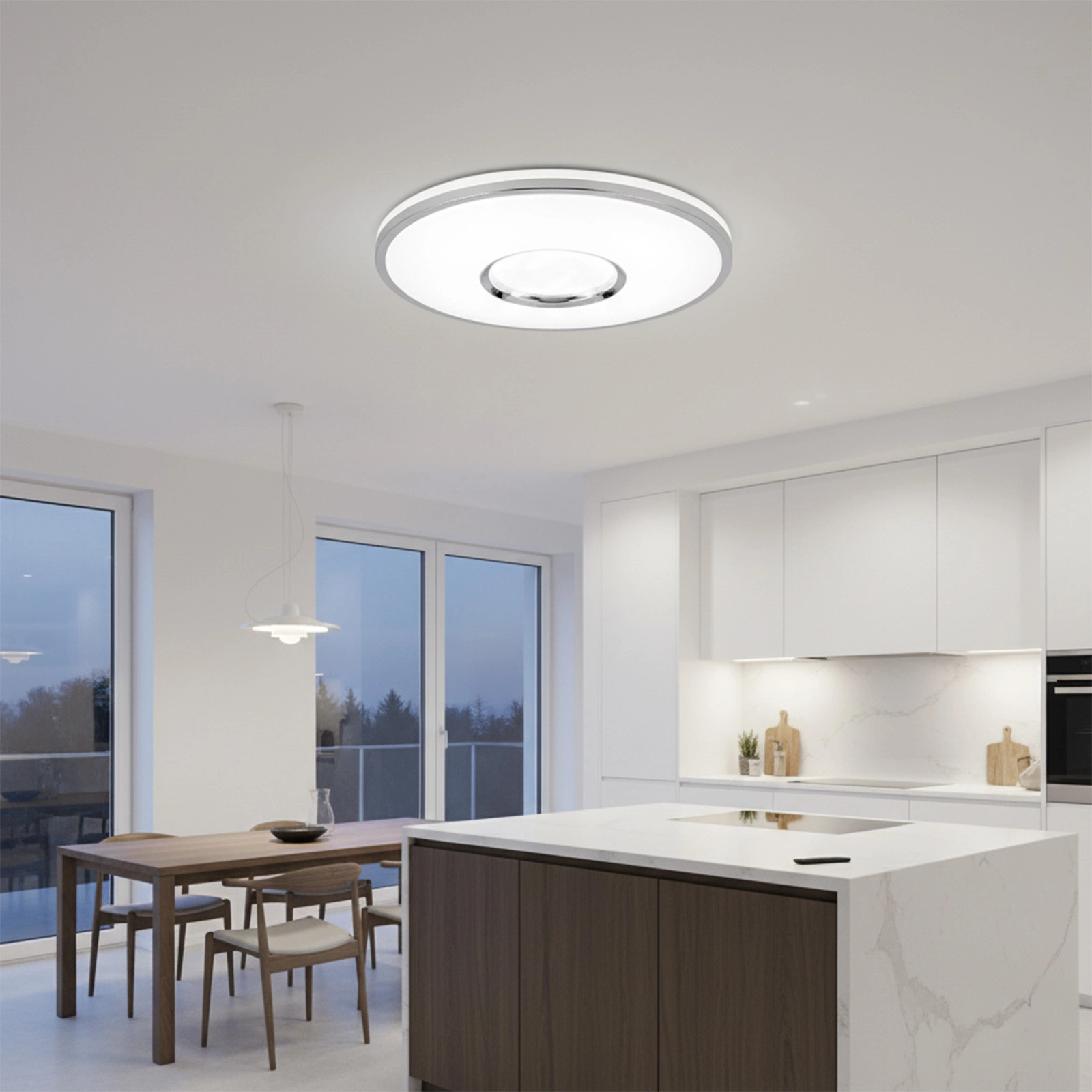 Stropní svítidlo Leon od Goldlux je moderní stropní LED svítidlo vyrobené z vysoce kvalitních materiálů, vyznačující se moderním a módním vzhledem. Svítidlo je vybaveno vysoce výkonnými, energeticky úspornými LED světelnými zdroji o celkovém výkonu 24W s možností změny barvy světla pomocí dálkového ovladače z teplé bílé 2700K na studenou bílou 6500K .