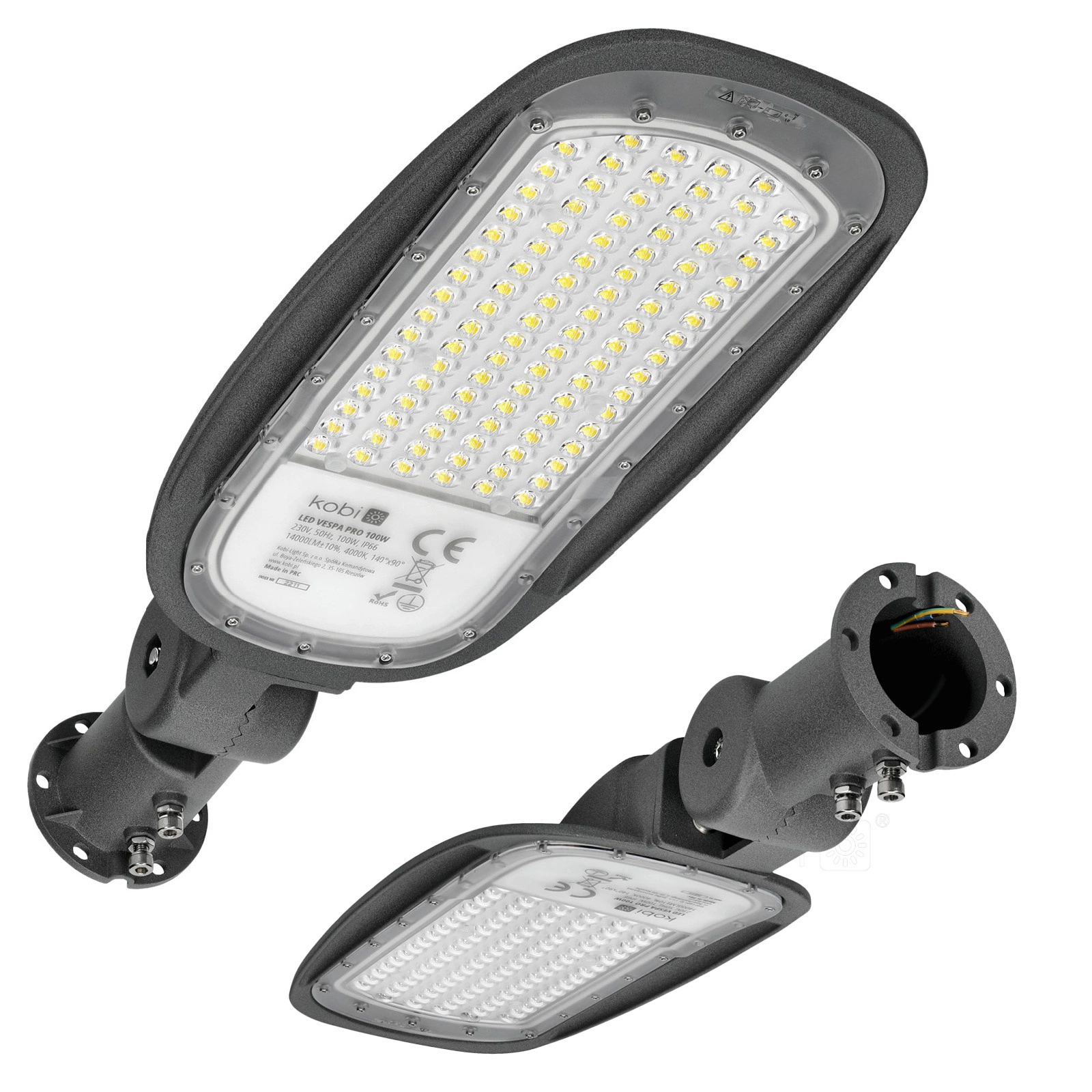 Průmyslová pouliční lampa LED Vespa od společnosti Kobi je ideálním řešením pro osvětlení venkovních prostor, jako jsou ulice, parkoviště, zahrady a terasy. Díky použití moderní technologie LED má lampa vysokou světelnou účinnost 140 lm/W, což zaručuje intenzivní a rovnoměrné osvětlení v každé situaci. Integrovaný 100W zdroj LED generuje světelný tok 14 000 lm a poskytuje neutrální barvu světla 4000 K, která je nezbytná pro zlepšení viditelnosti a bezpečnosti po setmění.