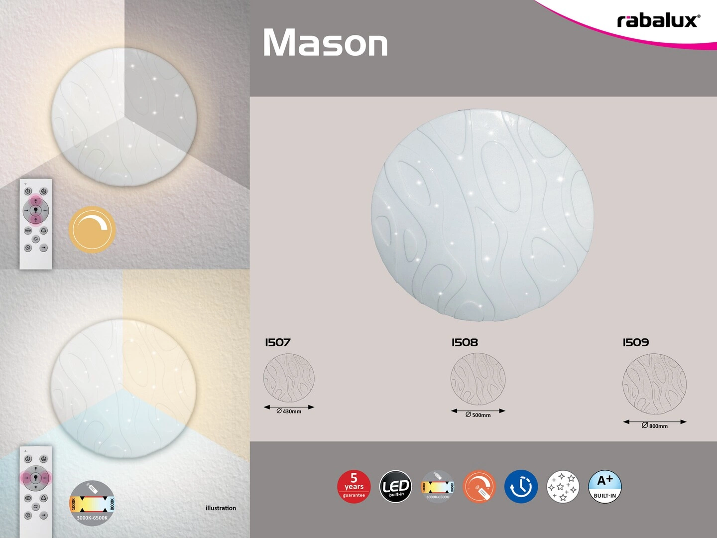 Podhledové svítidlo Mason LED od společnosti Rabalux je inovativní řešení osvětlení ideální pro moderní interiéry. Svítidlo má příkon 80 W a světelný tok 7200 lumenů. Vyznačuje se možností nastavení barevné teploty v rozmezí 3000-6500 K, což umožňuje přizpůsobit světlo individuálním potřebám a náladě místnosti. To správné nastavení si tak najdou milovníci teplého i studeného osvětlení.