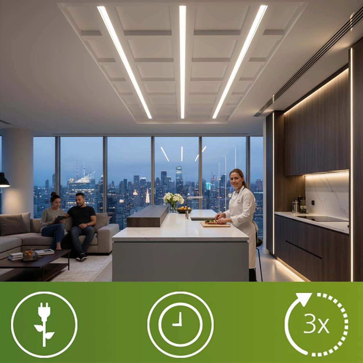 - O 80 % nižší spotřeba energie ve srovnání s tradičními nebo halogenovými světelnými zdroji