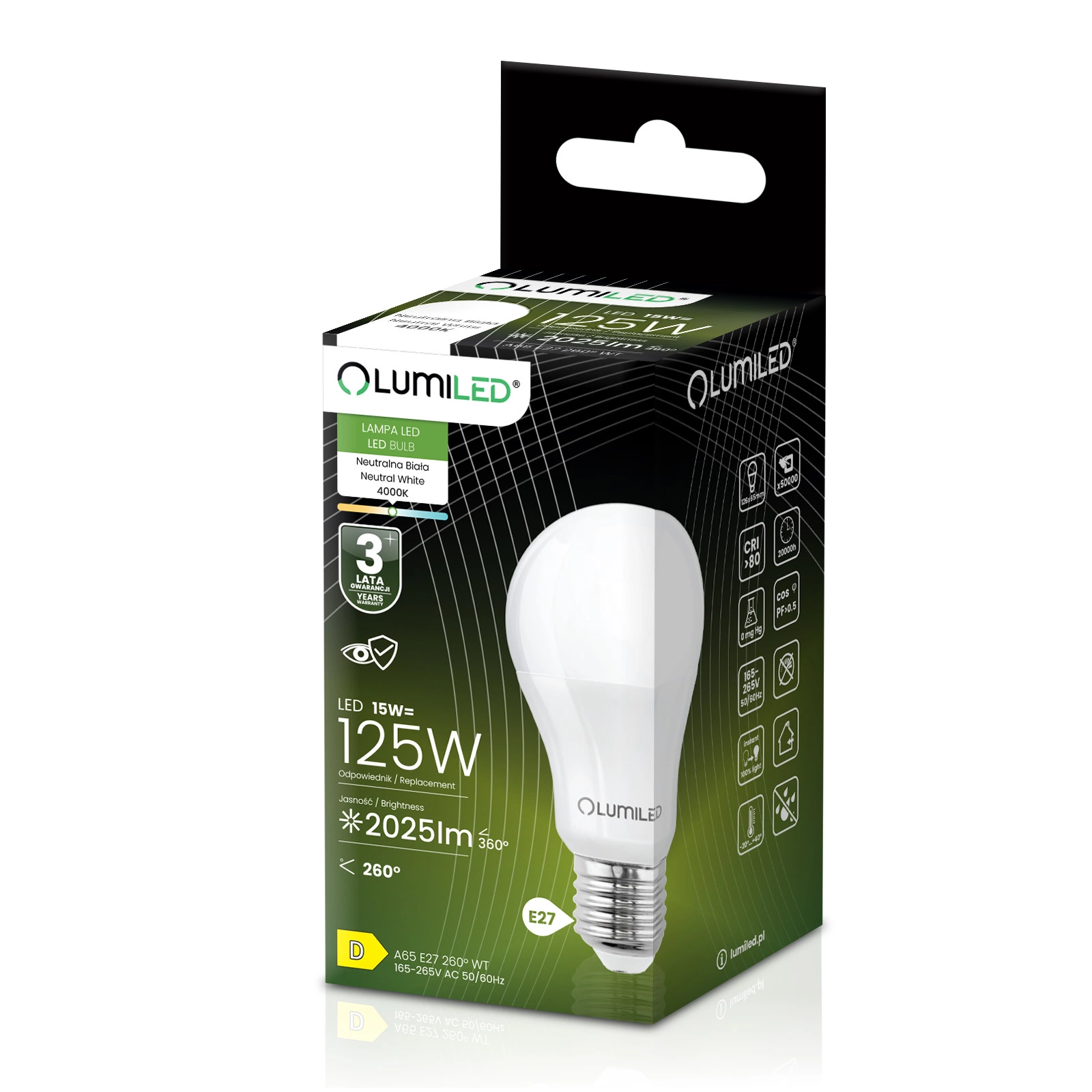 LED žárovka renomované značky LUMILED s paticí E27 a příkonem 15 W je vynikající náhradou za tradiční 120W žárovky a nabízí úsporu energie a delší životnost. Vyzařuje světlo se světelným tokem 1 952 lumenů a neutrální barvou 4000 K, takže je ideální pro osvětlení interiérů, kde je požadována jasná a přirozená barva světla. Úhel svícení 260° umožňuje široký rozptyl světla a účinně osvětluje místnost. Díky kvalitní konstrukci má životnost až 15 000 hodin, což znamená mnoho let používání. Kromě toho pracuje v širokém rozsahu napětí 165-265 V a je vhodný pro použití při okolních teplotách od -20 °C do +40 °C. Ideální volba pro ty, kteří si cení úspory energie a péče o životní prostředí.
