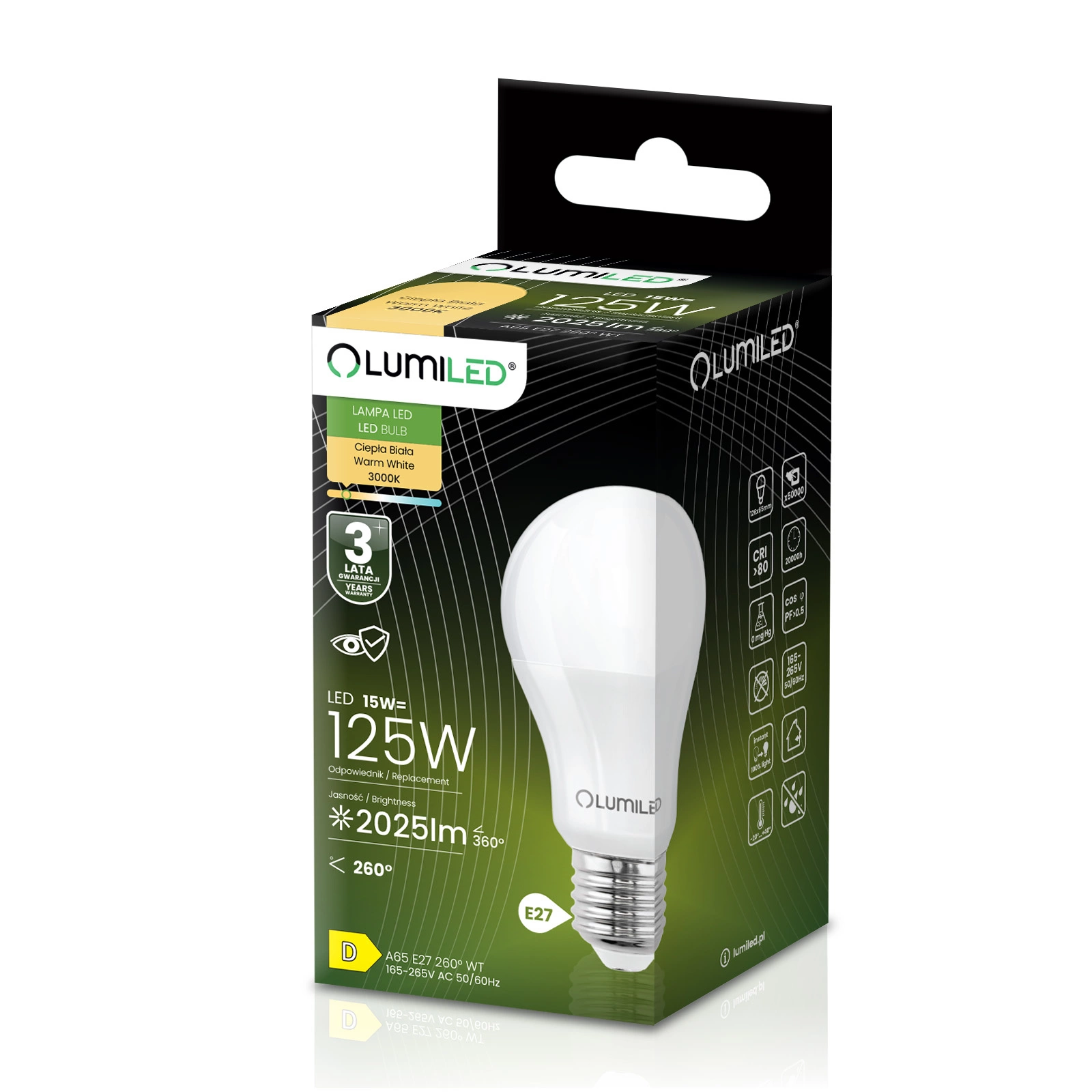LED žárovka renomované značky LUMILED s paticí E27 a příkonem 15 W je vynikající náhradou za tradiční 120W žárovky a nabízí úsporu energie a delší životnost. Vyzařuje světlo se světelným tokem 1 952 lumenů a neutrální barvou 4000 K, takže je ideální pro osvětlení interiérů, kde je požadována jasná a přirozená barva světla. Úhel svícení 260° umožňuje široký rozptyl světla a účinně osvětluje místnost. Díky kvalitní konstrukci má životnost až 15 000 hodin, což znamená mnoho let používání. Kromě toho pracuje v širokém rozsahu napětí 165-265 V a je vhodný pro použití při okolních teplotách od -20 °C do +40 °C. Ideální volba pro ty, kteří si cení úspory energie a péče o životní prostředí.
