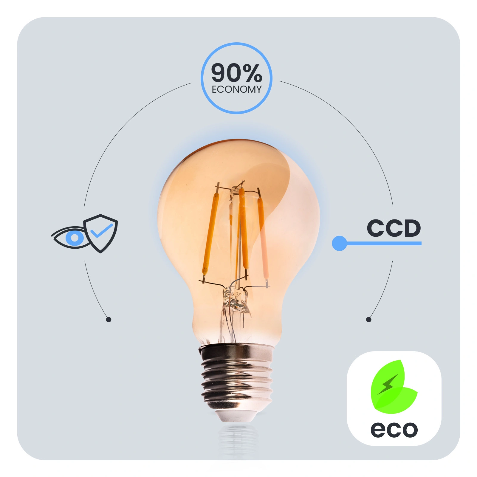 Díky měniči CCD použitému v žárovce LED je žárovka odolná vůči poklesům a špičkám síťového napětí. Světlo nebliká ani se netřese. Díky měniči CCD je žárovka dlouhodobě bezporuchová. Žárovky LUMILED jsou navrženy s ohledem na uživatele. Špatná kvalita osvětlení může vést k únavě očí, proto mají naše žárovky technický vývoj Eye Safe, který zajišťuje pohodlné a šetrné osvětlení pro vaše oči v jakékoli místnosti.