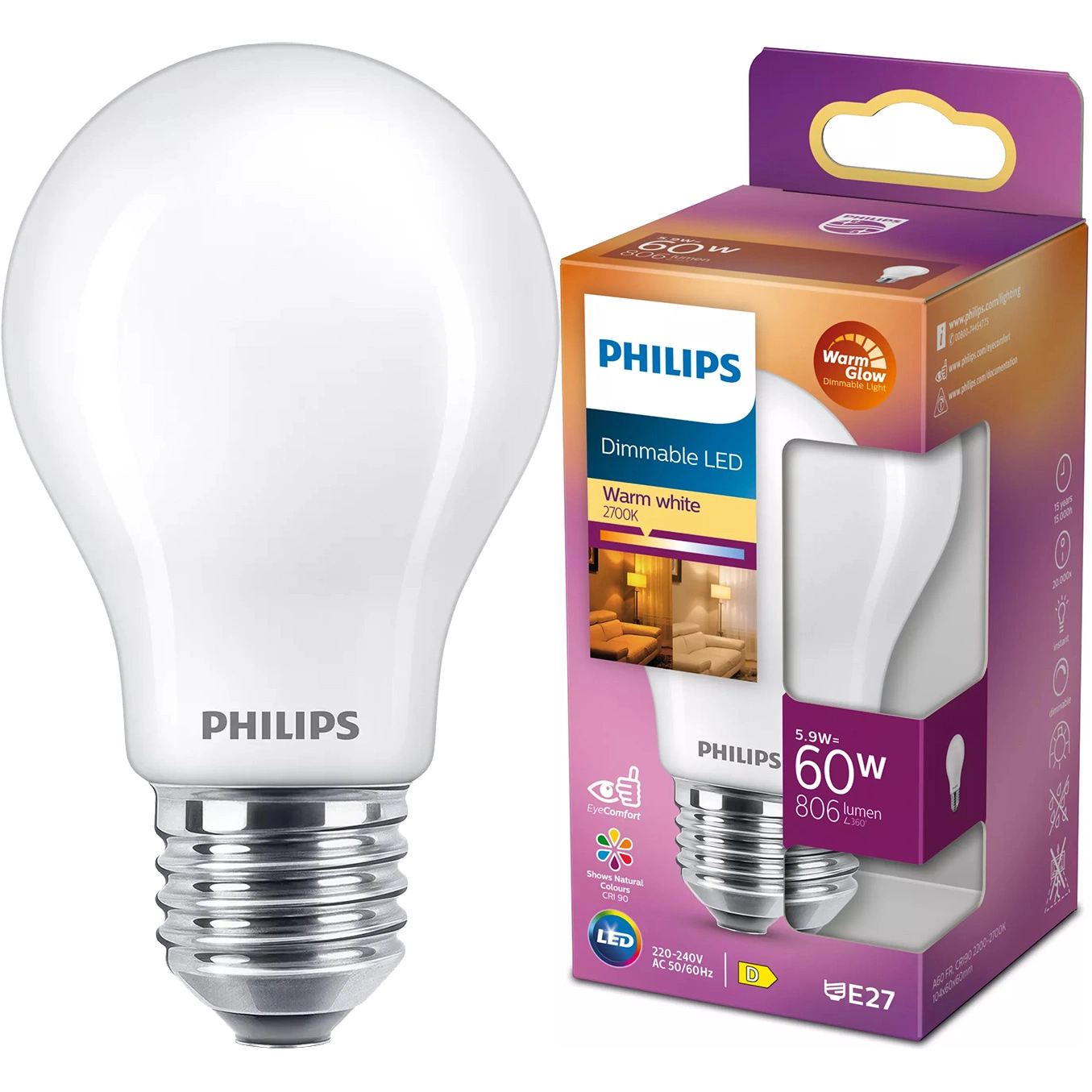 Moderní LED žárovka PHILIPS 5,9W s funkcí stmívání WarmGlow pro každodenní použití v interiéru. Umožňuje snížit spotřebu energie a snížit frekvenci výměny žárovek, čímž zajišťuje vysokou kvalitu světla. Standardní žárovka z opálového skla, stmívatelná, se závitem E27, 15 000 hodin provozu a světelný tok 806 lumenů. Výkon lampy odpovídá svitu 60W žárovky.