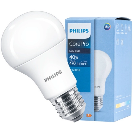 Žárovka CorePro LED od renomované a uznávané společnosti PHILIPS s paticí E27 a příkonem 5 W (odpovídá klasické 40W žárovce) je vysoce kvalitní světelný zdroj LED.
