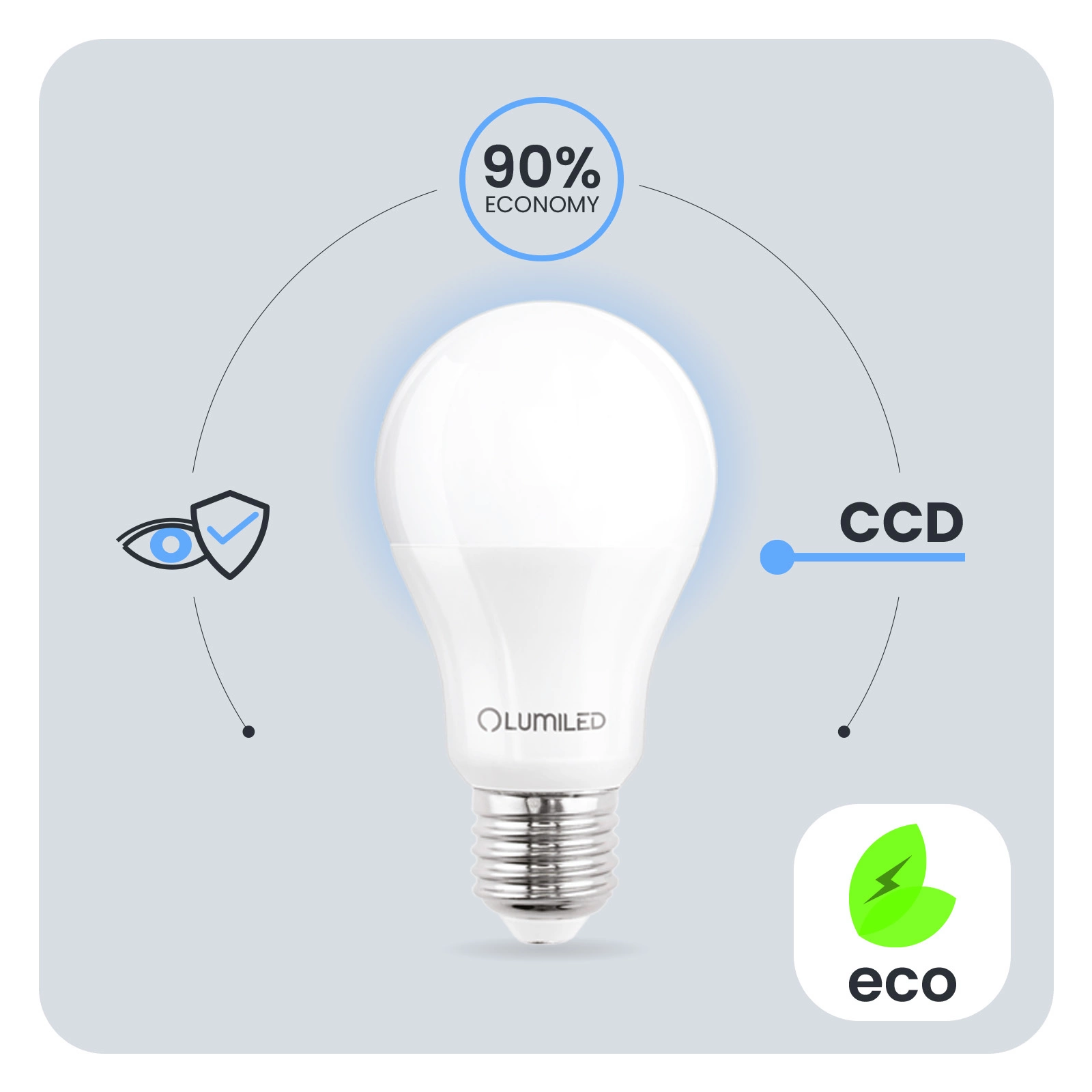 Díky měniči CCD použitému v žárovce LED je žárovka odolná vůči poklesům a špičkám síťového napětí. Světlo nebliká ani se netřese. Díky měniči CCD je žárovka dlouhodobě bezporuchová. Žárovky LUMILED jsou navrženy s ohledem na uživatele. Špatná kvalita osvětlení může vést k únavě očí, proto mají naše žárovky technický vývoj Eye Safe, který zajišťuje pohodlné a šetrné osvětlení pro vaše oči v jakékoli místnosti.
